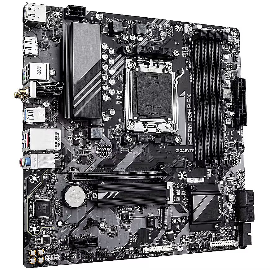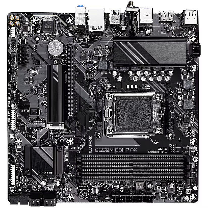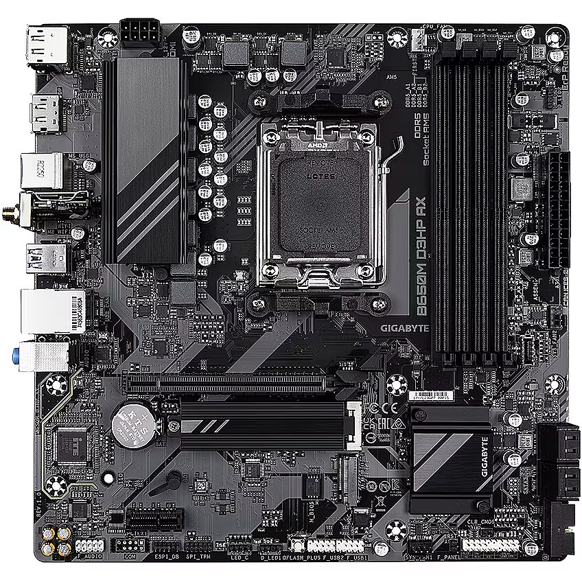 Summary - GIGABYTE B650M D3HP AX Motherboard - AMD Ryzen 9000 Series CPUs, 5+2+2 Phases VRM, up to 8000MHz DDR5 (OC), 2xPCIe 4.0 M.2, WIFI 6E, 2.5GbE LAN, USB 3.2 Gen 1. Processor manufacturer: AMD, Processor socket: Socket AM5, Compatible processor series: AMD Ryzen 7000 Series, AMD Ryzen 8000 Series, AMD Ryzen 9000 Series. Supported memory types: DDR5-SDRAM, Maximum internal memory: 256 GB, Memory slots type: DIMM. Supported storage drive interfaces: M.2, SATA III, Supported storage drive types: HDD & SSD, RAID levels: 0, 1, 10. Maximum resolution: 4096 x 2160 pixels. Ethernet interface type: 2.5 Gigabit Ethernet, LAN controller: Realtek RTL8125, Top Wi-Fi standard: Wi-Fi 6E (802.11ax)