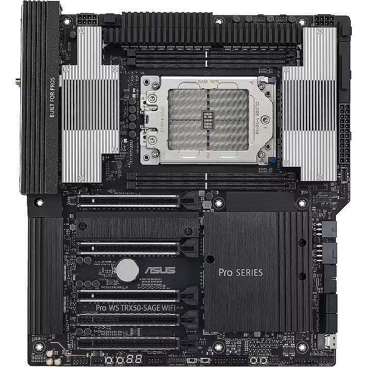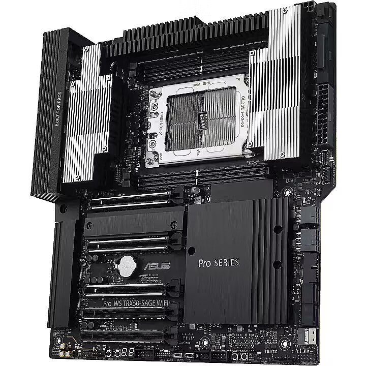 LongDesc - A WORKSTATION WONDERLANDThe Pro WS TRX50-SAGE WIFI motherboard offers elite speed, compatibility and stability tailored to content creation, software development, machine learning and more. Thirty-six power stages fuel AMD Ryzen Threadripper™ PRO 7000 WX-series and AMD Ryzen Threadripper™ 7000 series processors with up to 96 cores, while supporting up to 1 TB of R-DIMM DDR5 modules, delivering the performance potential that professionals need for cutting-edge applications.With onboard PCIe® power connectors offering additional support for multiple graphics cards, active cooling and heat pipes on the VRM heatsinks, WiFi 7, USB 20Gbps port, SlimSAS and IMPI support, the Pro WS TRX50-SAGE WIFI comes prepared for a wide array of scenarios and industries.CPU AND MEMORY OVERCLOCKING READYFor AMD TR5 series workstations and high-end desktop (HEDT) models, AMD offers CPU and DRAM overclocking options. To fully leverage the performance of these processors, ASUS has incorporated an innovative dual PSU design on the Pro WS TRX50-SAGE WIFI motherboard. Along with robust power delivery and advanced cooling modules, this board exhibits remarkable stability during overclocking. Hardware switches and optimized BIOS options on the motherboard provide overclocking enthusiasts with greater convenience when pushing their systems to the limit. You may further boost your memory performance by enabling EXPO settings. The comprehensive synergy of EXPO and ECC R-DIMM further combines exceptional performance with outstanding stability, setting a new standard for workstation and high-end desktop computing.ProCool II ConnectorsProCool II connectors ensure a snug and reliable connection to the 12V CPU input. This second generation features improved heat dissipation and a metal shroud.Onboard PCIe Power ConnectorsAn 8-pin and 6-pin PCIe cable connector built into the motherboard can ensure power output stability when multiple graphic cards need to be installed.ECC R-DIMM Memory SupportThe Pro WS TRX50-SAGE WIFI motherboard boasts a robust design featuring four R-DIMM DDR5 memory module slots with ECC support, a feature that improves the prevention of system crashes and data corruption, thereby ensuring that a workstation remains reliable and responsive for professional demands.ULTRAFAST CONNECTIVITYMulti-GPU SupportThe Pro WS TRX50-SAGE WIFI motherboard features several PCIe® 5.0/4.0 x16 slots that provide flexible system configurability and expandability. With high-powered graphics cards, it can bring enhanced performance in modelling, simulation and rendering applicationsDual transceivers support the 2.4, 5 and 6 GHz bands to enable faster throughput to improve signal quality and cover greater distances. With Q-Antenna, attaching a WiFi antenna to your PC is now easy and fast. Instead of slowly rotating two fasteners until they finally lock in, they just snap into place. Less hassle, and more consistent performance.WiFi 7Next-gen WiFi 71 include the 6 GHz band and 4096 QAM, delivering up to 2.8X ultra-fast WiFi speeds. The revolutionary Multi-Link Operation (MLO)2 provides a more stable WiFi connection and lower latency, unlocking the realms of the unknown in gaming, streaming, and industrial IoT.Dual transceivers support the 2.4, 5 and 6 GHz bands to enable faster throughput to improve signal quality and cover greater distances. With Q-Antenna, attaching a WiFi antenna to your PC is now easy and fast. Instead of slowly rotating two fasteners until they finally lock in, they just snap into place. Less hassle, and more consistent performance.Marvell® AQtion 10 Gbp EthernetWith up to 10 times the bandwidth of standard gigabit Ethernet, streaming uncompressed 4K UHD videos, performing system backups and transferring large files is now faster than ever before.Using a golden light, mark the location of the 2.5 Gbps Ethernet port on the back I/O.Intel® 2.5 Gb EthernetProvides up to 2.5 faster transfers versus standard 1 Gb Ethernet connections for faster downloads and smoother high-res video streaming.Embrace Next-Generation USB4®Faster than ever and future-proof; once connected to this motherboard’s onboard USB4 header, the USB4 expansion card will enable bi-directional speeds of up to 40 Gbps and provide ample power to fast-charge devices.M.2 PCIe 5.0/4.0 slotsThe Pro WS TRX50-SAGE WIFI motherboard also offers three M.2 slots—two PCIe 5.0 and one PCIe 4.0—to enhance storage flexibility and performance. This configuration is ideal for creators who work with massive video files, as it supports RAID configurations across multiple NVMe devices to achieve massive I/O bandwidth and to ensure seamless playback in editing bays.SlimSAS slotThe Pro WS TRX50-SAGE WIFI motherboard also features a SlimSAS port for connecting industrial SSD drives, servers and networking equipment.Server-grade Remote ManagementASUS IPMI Expansion CardThe Pro WS TRX50-SAGE WIFI is compatible with ASUS IPMI Expansion card featuring a dedicated Ethernet-to-BMC chip that provides the intelligence for its IPMI architecture. Administrators can remotely communicate with the BMC to take some corrective actions — such as firmware update or power cycling a system.ASUS Control Center ExpressThe Pro WS TRX50-SAGE WIFI comes with ASUS Control Center Express - a real-time IT monitoring and management software designed for business that improves productivity and enhances security, helping prevent unauthorized access and data leaks.M.2 CoolingAll three M.2 slots come with large heatsinks to keep NVMe storage at the optimal operating temperature for consistent performance and reliability. M.2 thermal pads on select slots go even further to ensure peak performance from next-gen drives.EZ DIY DesignSafeSlot & SafeDIMMPCIe 5.0 is 2x faster than PCIe 4.0, so ASUS adapted its SMT manufacturing process to ensure the highest data speeds for its SafeSlot design. SafeSlot is a reinforced metal sheath added to a PCIe slot to keep an expansion card 