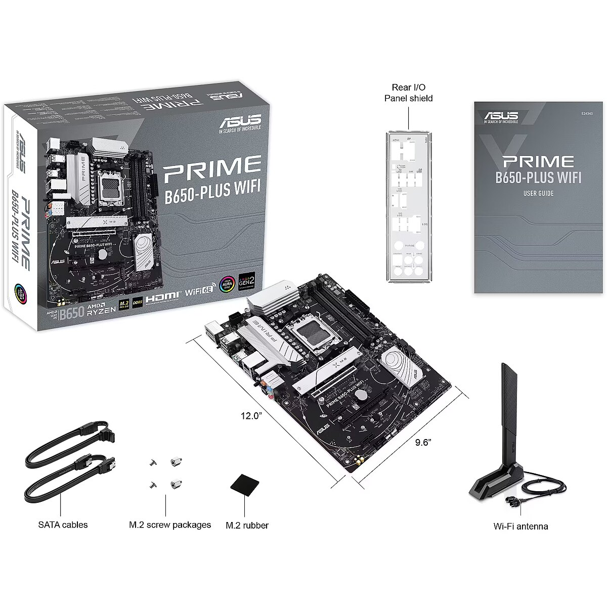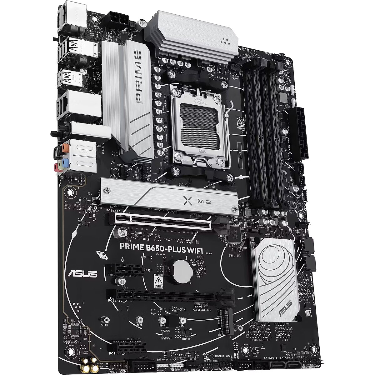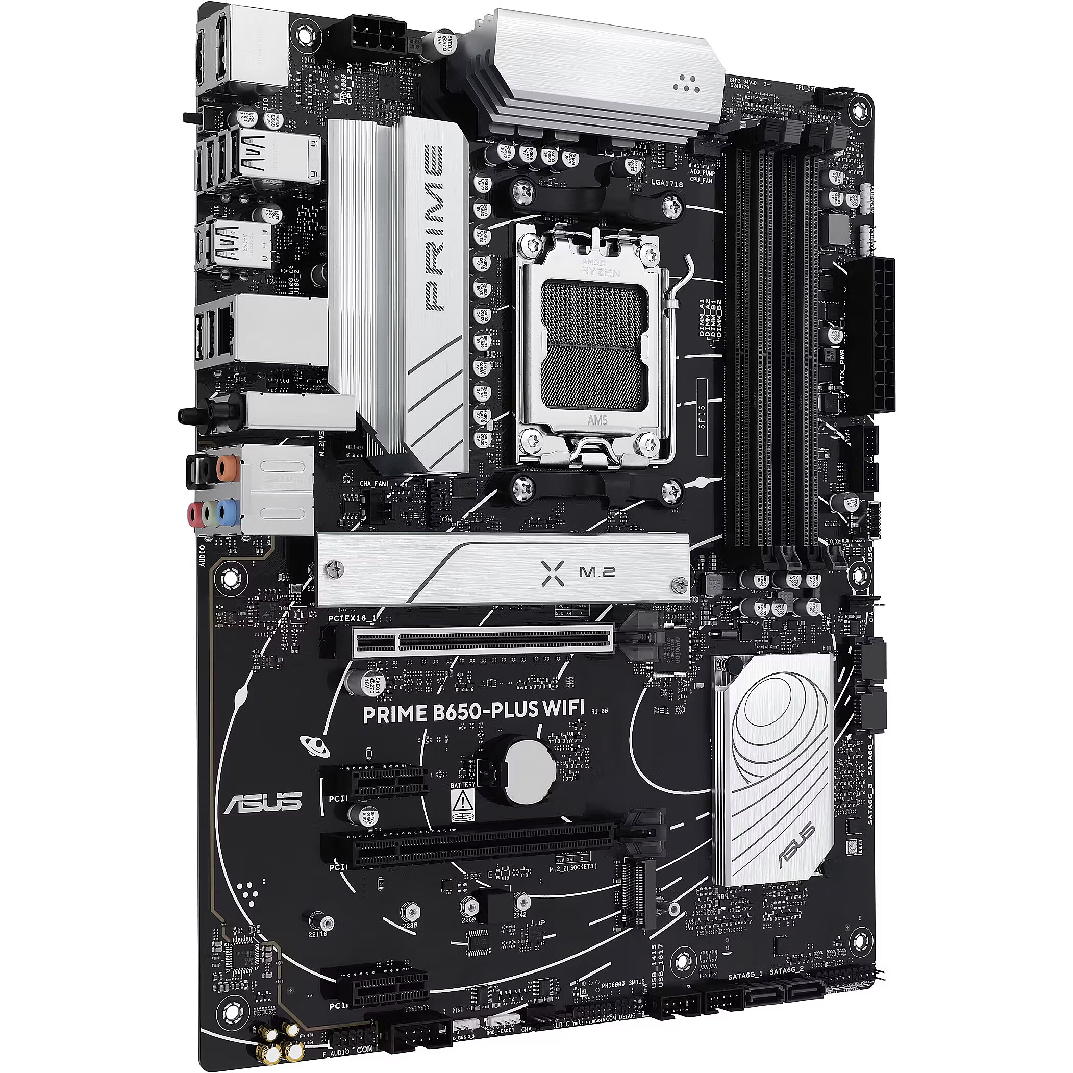 LongSummaryDescription - ASUS PRIME B650-PLUS WIFI. Processor manufacturer: AMD, Processor socket: Socket AM5, Compatible processor series: AMD Ryzen 7000 Series, AMD Ryzen 8000 Series, AMD Ryzen 9000 Series. Supported memory types: DDR5-SDRAM, Maximum internal memory: 192 GB, Memory slots type: DIMM. Supported storage drive interfaces: M.2, SATA III, Supported storage drive types: HDD & SSD, RAID levels: 0, 1, 10. Ethernet interface type: 2.5 Gigabit Ethernet, Top Wi-Fi standard: Wi-Fi 6E (802.11ax), Wi-Fi standards: Wi-Fi 6E (802.11ax). Component for: PC, Motherboard form factor: ATX, Motherboard chipset family: AMD