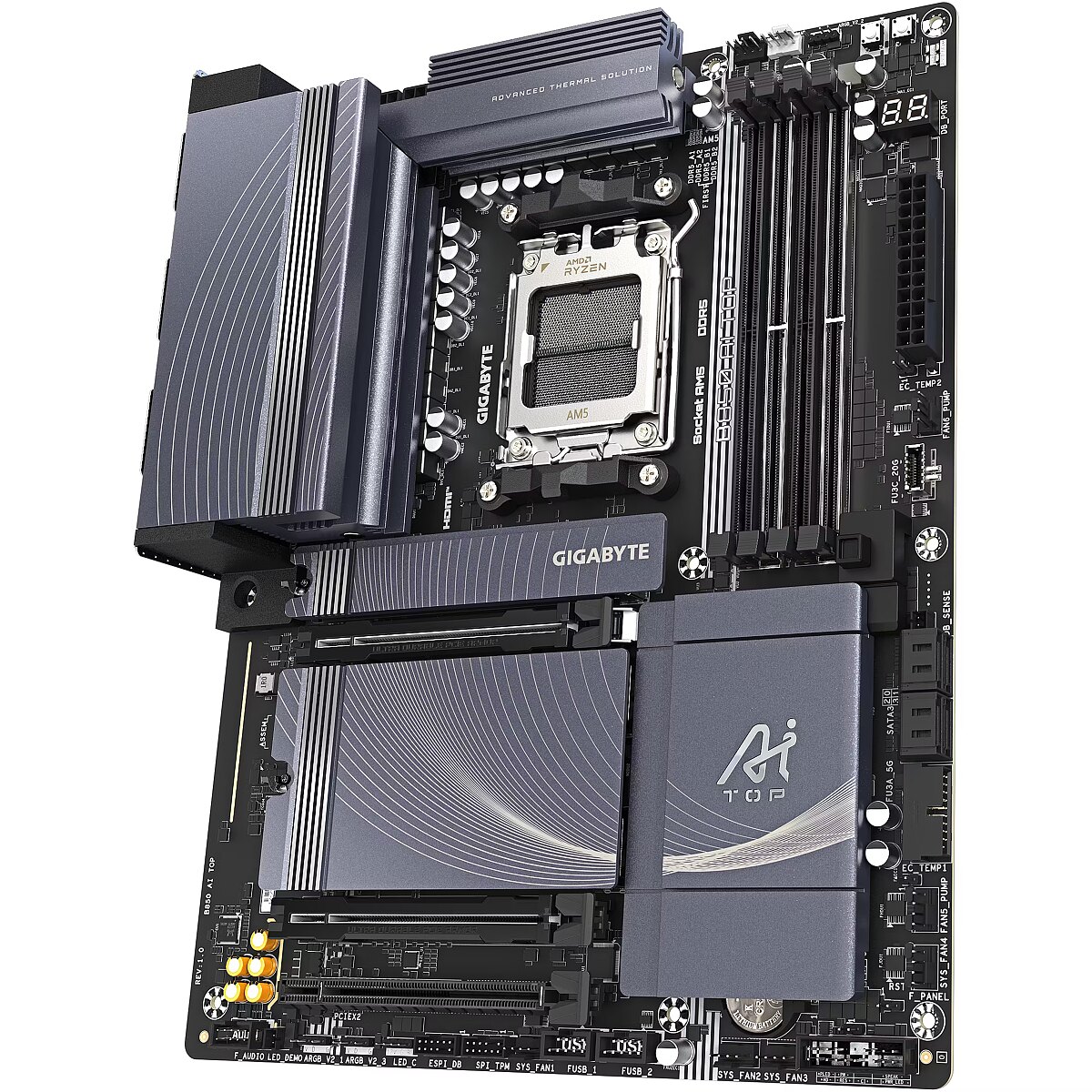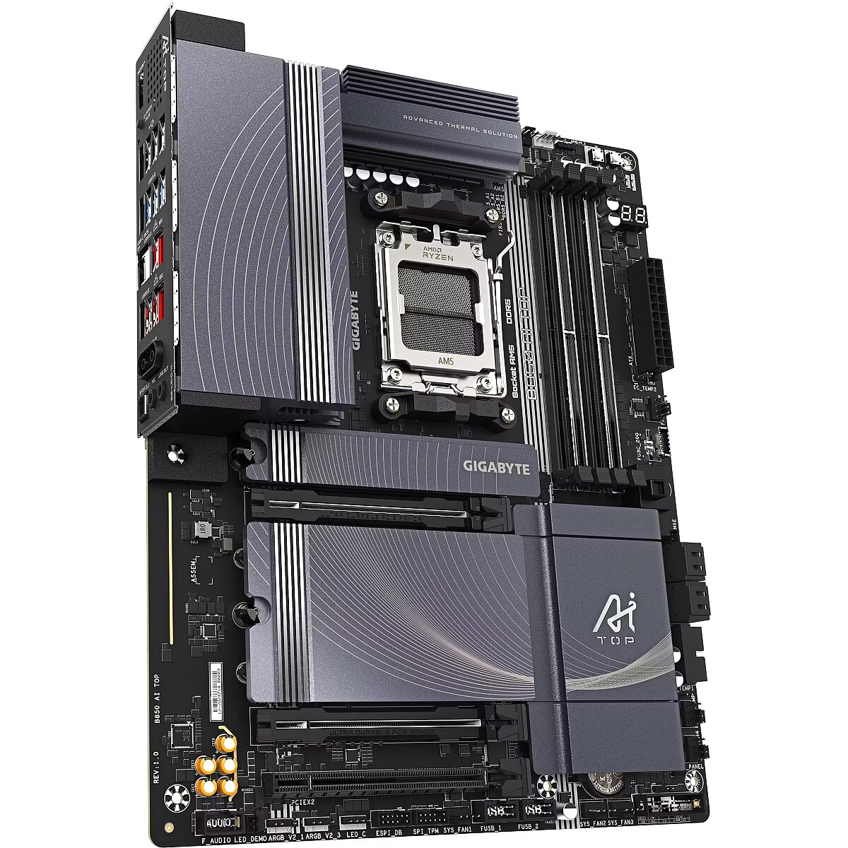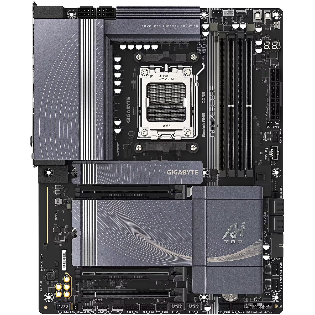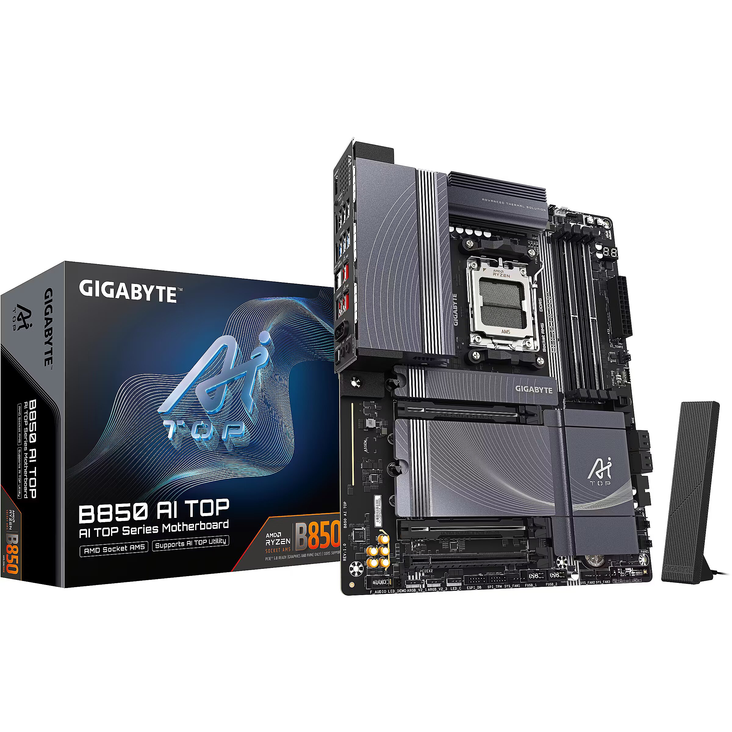 ShortSummaryDescription - GIGABYTE B850 AI TOP Motherboard - AMD Ryzen 9000 Series CPUs, 16+2+2 Phases Digital VRM, up to 8600MHz DDR5 (OC), 2xPCIe 5.0 + 1xPCIe 4.0 M.2, 10 LAN, WIFI 7, USB 3.2 Gen 2x2, AMD, Socket AM5, AMD Ryzen 7000 Series, AMD Ryzen 8000 Series, AMD Ryzen 9000 Series, Socket AM5, DDR5-SDRAM, 256 GB
