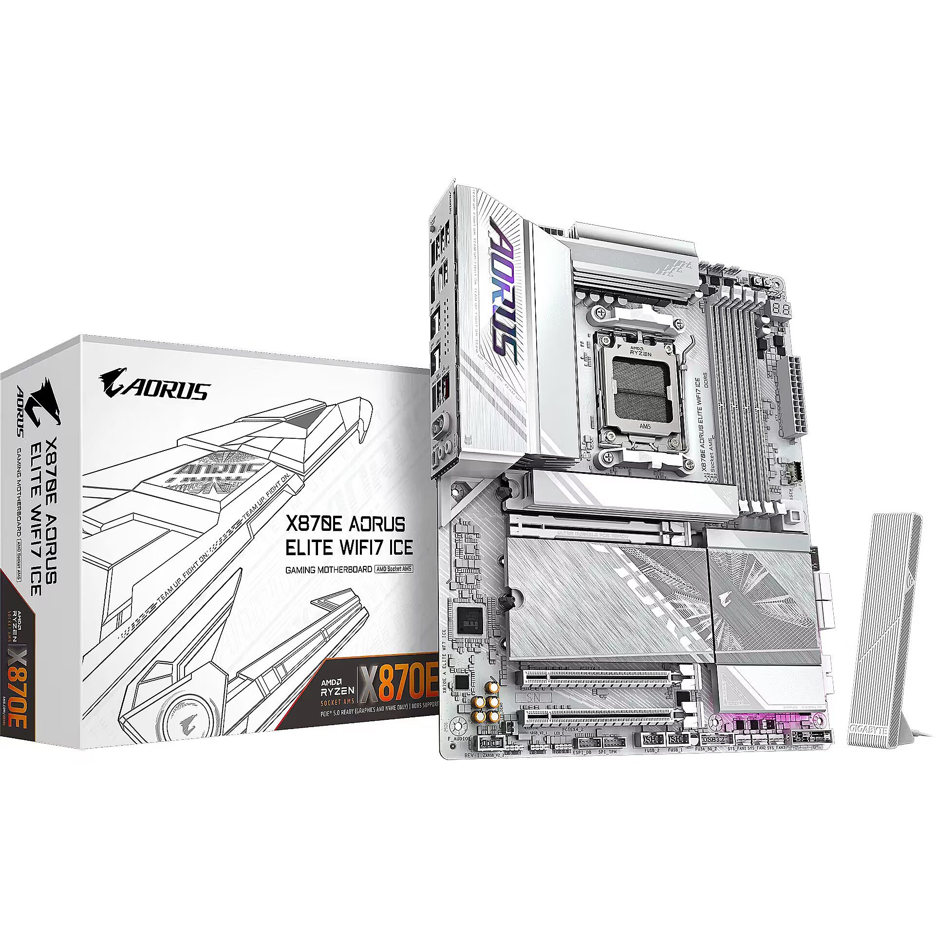 LongSummaryDescription - GIGABYTE X870E AORUS ELITE WIFI7 ICE Motherboard - Supports AMD Ryzen 9000 CPUs, 16+2+2 Phases Digital VRM, up to 8200Hz DDR5 (OC), 3xPCIe 5.0 + 1xPCIe 4.0, Wi-Fi 7, 2.5GbE LAN, USB 4. Processor manufacturer: AMD, Processor socket: Socket AM5, Compatible processor series: AMD Ryzen 7000 Series, AMD Ryzen 8000 Series, AMD Ryzen 9000 Series. Supported memory types: DDR5-SDRAM, Maximum internal memory: 256 GB, Memory slots type: DIMM. Supported storage drive interfaces: M.2, PCI Express 5.0, SATA III, Supported storage drive types: HDD & SSD, RAID levels: 0, 1, 5, 10. Maximum resolution: 4096 x 2160 pixels. Ethernet interface type: 2.5 Gigabit Ethernet, LAN controller: Realtek RTL8125, Top Wi-Fi standard: Wi-Fi 7 (802.11be)