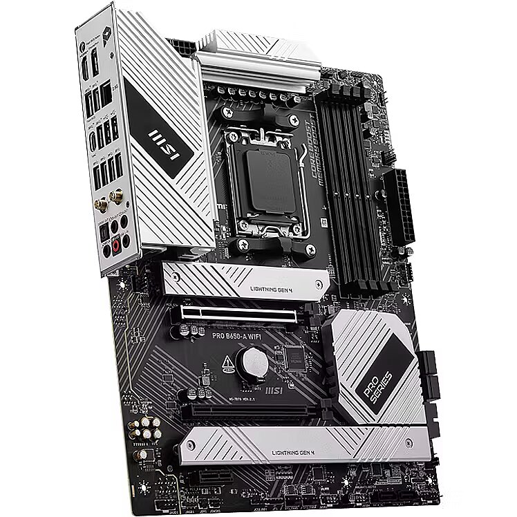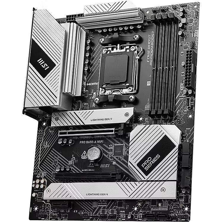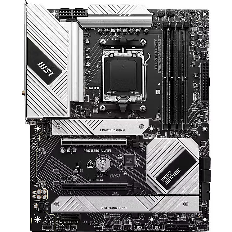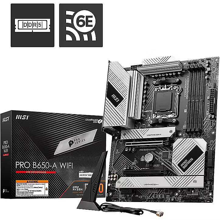 Description - PRO B650-A WIFI Supports AMD Ryzen™ 9000 / 8000 / 7000 Series Desktop Processors Supports DDR5 Memory, Dual Channel DDR5 7600+MHz (OC) Enhanced Power Design: 14+2 DRPS with 80A SPS, dual 8-pin CPU power connectors, Core Boost, Memory Boost Premium Thermal Solution: Extended Heatsink, MOSFET thermal pads rated for 7W/mK, additional choke thermal pads and M.2 Shield Frozr are built for high performance system and non-stop work High Quality PCB: 6-layer PCB made by 2oz thickened copper Lightning Fast experience: PCIe 4.0 slots, Lightning Gen 4 x4 M.2 with M.2 Shield Frozr, USB 3.2 Gen 2x2 2.5G LAN with Wi-Fi 6E Solution: Upgraded network solution for professional and multimedia use. Delivers a secure, stable and fast network connection AUDIO BOOST 5: Reward your ears with studio grade sound quality for the most immersive gaming experience