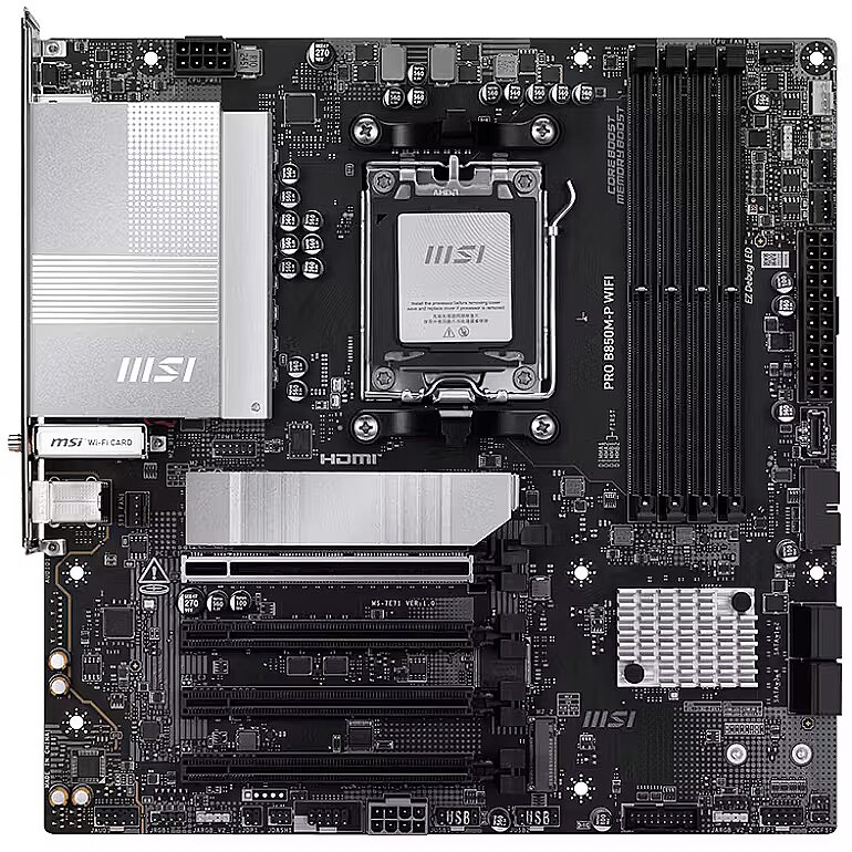 Description - PRO B850M-P WIFI PRO B850M-P WIFI offers a simple design with a harmonious silver color scheme that perfectly matches both white and black PC builds. It is engineered with many exclusive features of MSI, a Wi-Fi 7 with EZ Antenna, 5G LAN, PCIe 5.0 M.2 with EZ M.2 Shield Frozr II, and Supplemental PCIe Power, ready for the AMD Ryzen™ 9000 series processors. Supports AMD Ryzen™ 9000 / 8000 / 7000 Series Desktop Processors Supports DDR5 Memory, Dual Channel DDR5 8200+ MT/s (OC) Ultra Performance: Direct 7+2+1 Power System with P-PAK, 8-pin CPU power connector, Core Boost, Memory Boost, 6-layer PCB made by 2oz thickened copper and server-grade level material Frozr Guard: Extended Heatsink, MOSFET thermal pads rated for 7W/mK, additional choke thermal pads and EZ M.2 Shield Frozr II are built for high performance system and non-stop experience EZ DIY: EZ M.2 Shield Frozr II, EZ M.2 Clip II, EZ PCIe Clip II and EZ Antenna Lightning Fast Game experience: PCIe 5.0 slot and Lightning Gen 5 x4 M.2 5G LAN with Wi-Fi 7 Solution: the latest solution for professional and multimedia use, delivering secure, stable, and high-speed networking and data transmission Audio Boost: Reward your ears with studio grade sound quality for the most immersive gaming experience