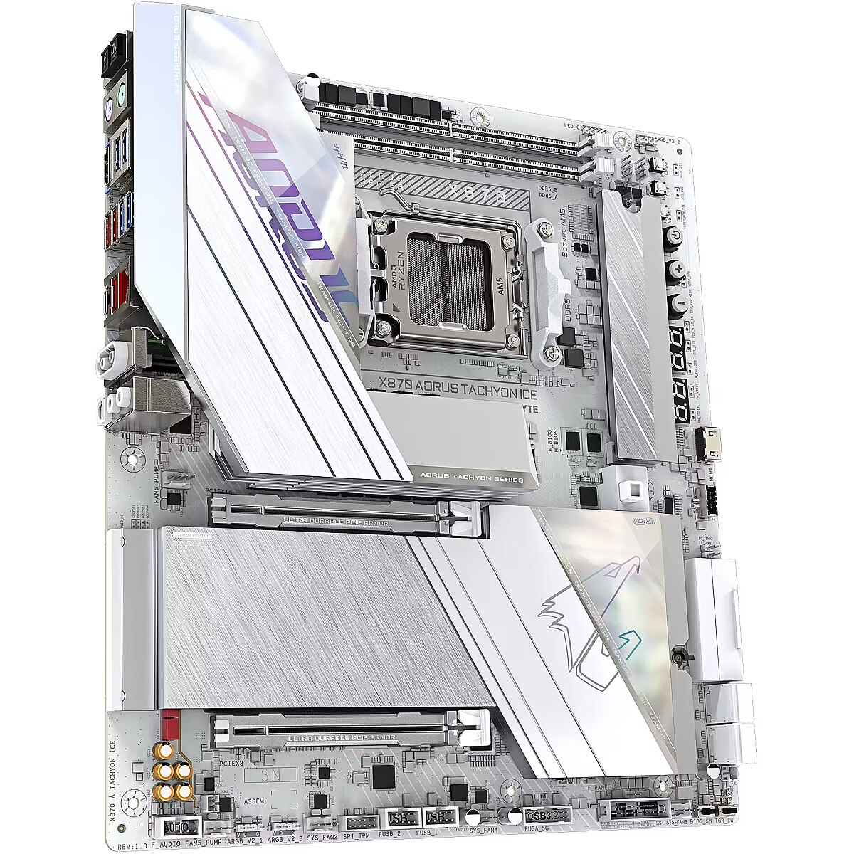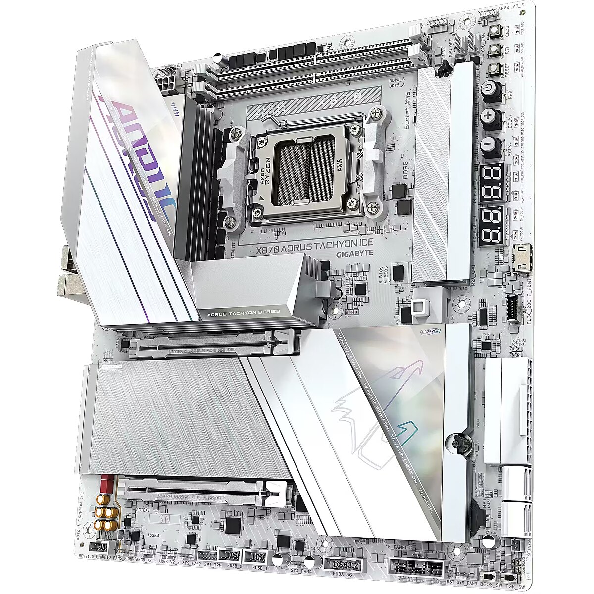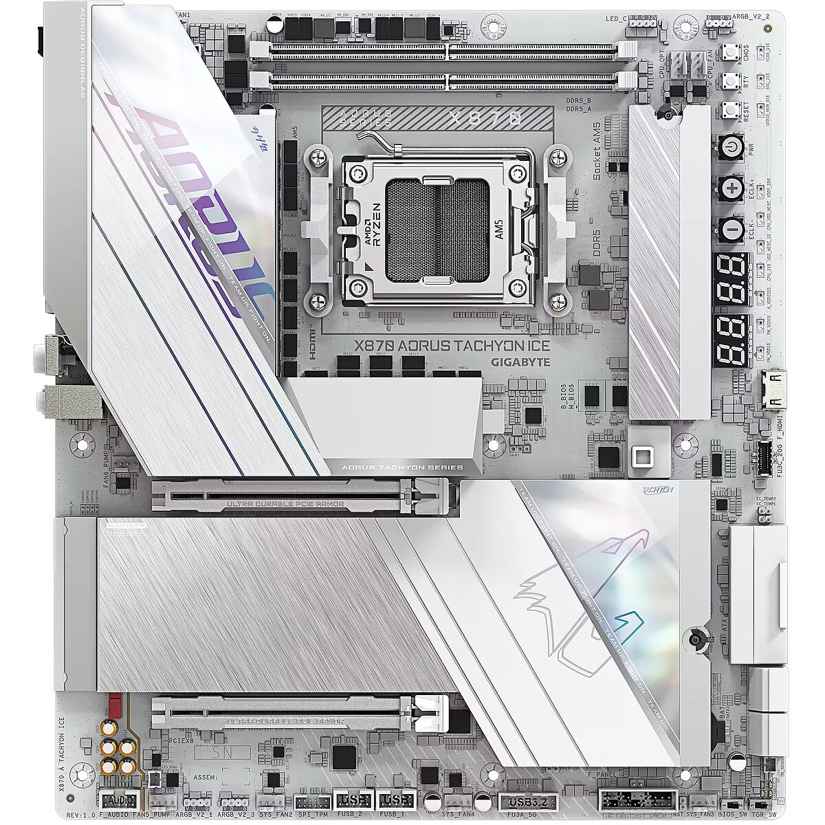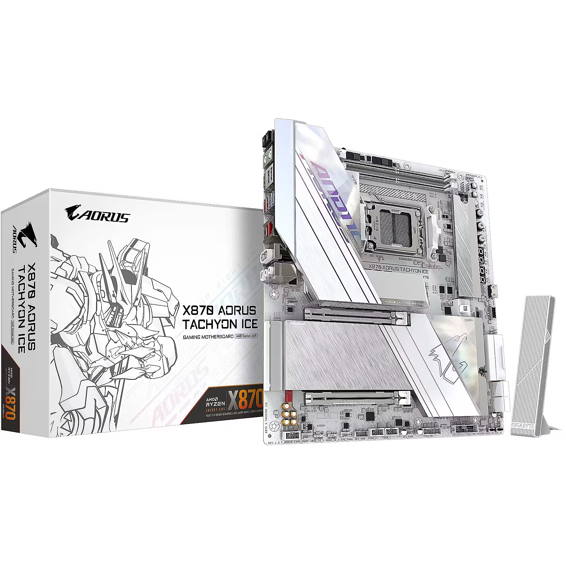 ShortSummaryDescription - GIGABYTE X870 AORUS TACHYON ICE Motherboard - Supports AMD Ryzen 9000 CPUs, 18+2+2 Phases Digital VRM, up to 9600Hz DDR5 (OC), 1xPCIe 5.0 + 2xPCIe 4.0, Wi-Fi 7, 5 GbE LAN, USB 4, AMD, Socket AM5, AMD Ryzen 7000 Series, AMD Ryzen 8000 Series, AMD Ryzen 9000 Series, Socket AM5, DDR5-SDRAM, 128 GB