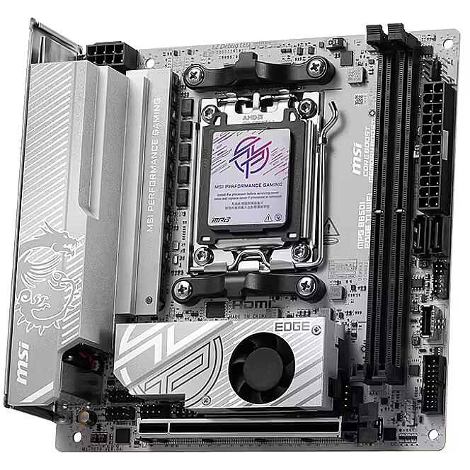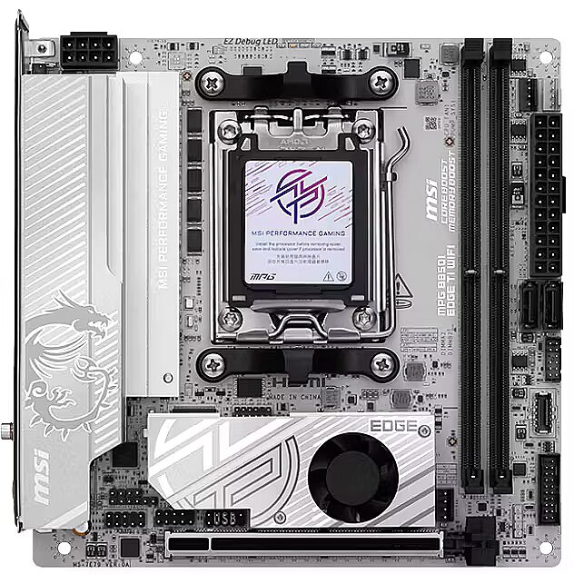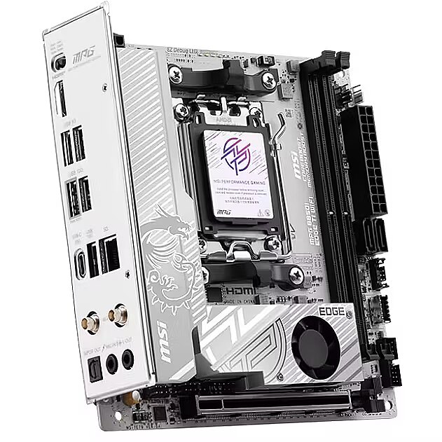Description - MPG B850I EDGE TI WIFI MPG B850I EDGE TI WIFI is covered with a silver-white color scheme for white PC build lovers to show off different identity. It is also powerful because of its true Wi-Fi 7 solution, 5G LAN, and the latest PCIe 5.0 compatibility, Supplemental PCIe Power, and this is the best white theme X870 ITX motherboard for AMD Ryzen™ 9000 series processors. Supports AMD Ryzen™ 9000 / 8000 / 7000 Series Desktop Processors Supports DDR5 Memory, Dual Channel DDR5 8200+ MT/s (OC) Ultra Performance: Direct 8+2+1 Power Design, Core Boost, Memory Boost, 10-layer PCB made by 2oz thickened copper and server-grade level material Frozr Guard: Enlarged heatsink, MOSFET thermal pads rated for 7W/mk and M.2 Shield Frozr are built for high performance system and non-stop gaming experience EZ DIY: EZ Antenna, EZ Conn-Design and EZ Front Panel Cable Lightning Fast Game experience: PCIe 5.0 slot, Lightning Gen 5 M.2 High-speed Connectivity: 5G LAN with Wi-Fi 7 Solution and USB 20Gbps- The latest solution for professional and multimedia use, delivering secure, stable, and high-speed networking and data transmission Audio Boost 5: Reward your ears with studio grade sound quality for the most immersive gaming experience