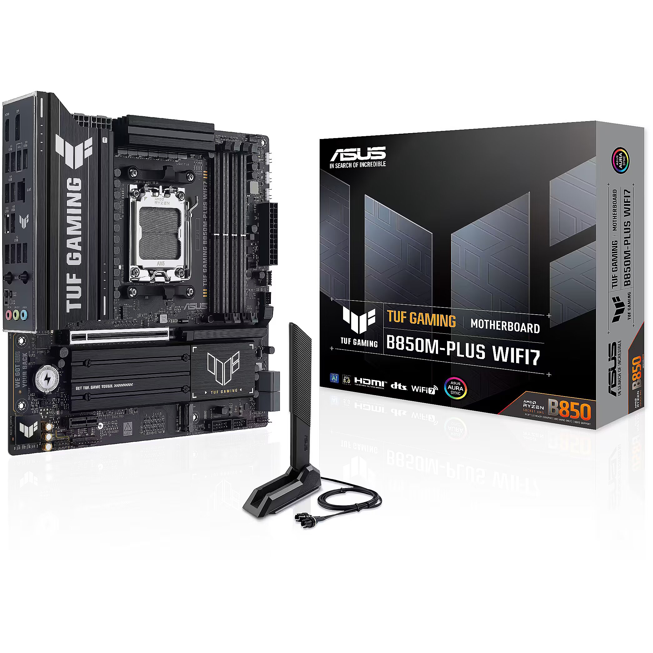 LongSummaryDescription - ASUS TUF GAMING B850M-PLUS WIFI7. Processor manufacturer: AMD, Processor socket: Socket AM5, Compatible processor series: AMD Ryzen 7000 Series, AMD Ryzen 8000 Series, AMD Ryzen 9000 Series. Supported memory types: DDR5-SDRAM, Maximum internal memory: 256 GB, Memory slots type: DIMM. Supported storage drive interfaces: PCI Express 4.0, PCI Express 5.0, Supported storage drive types: HDD & SSD, RAID levels: 0, 1, 5, 10. Ethernet interface type: 2.5 Gigabit Ethernet, Top Wi-Fi standard: Wi-Fi 7 (802.11be), Wi-Fi standards: Wi-Fi 7 (802.11be). Component for: PC, Motherboard form factor: micro ATX, Motherboard chipset family: AMD