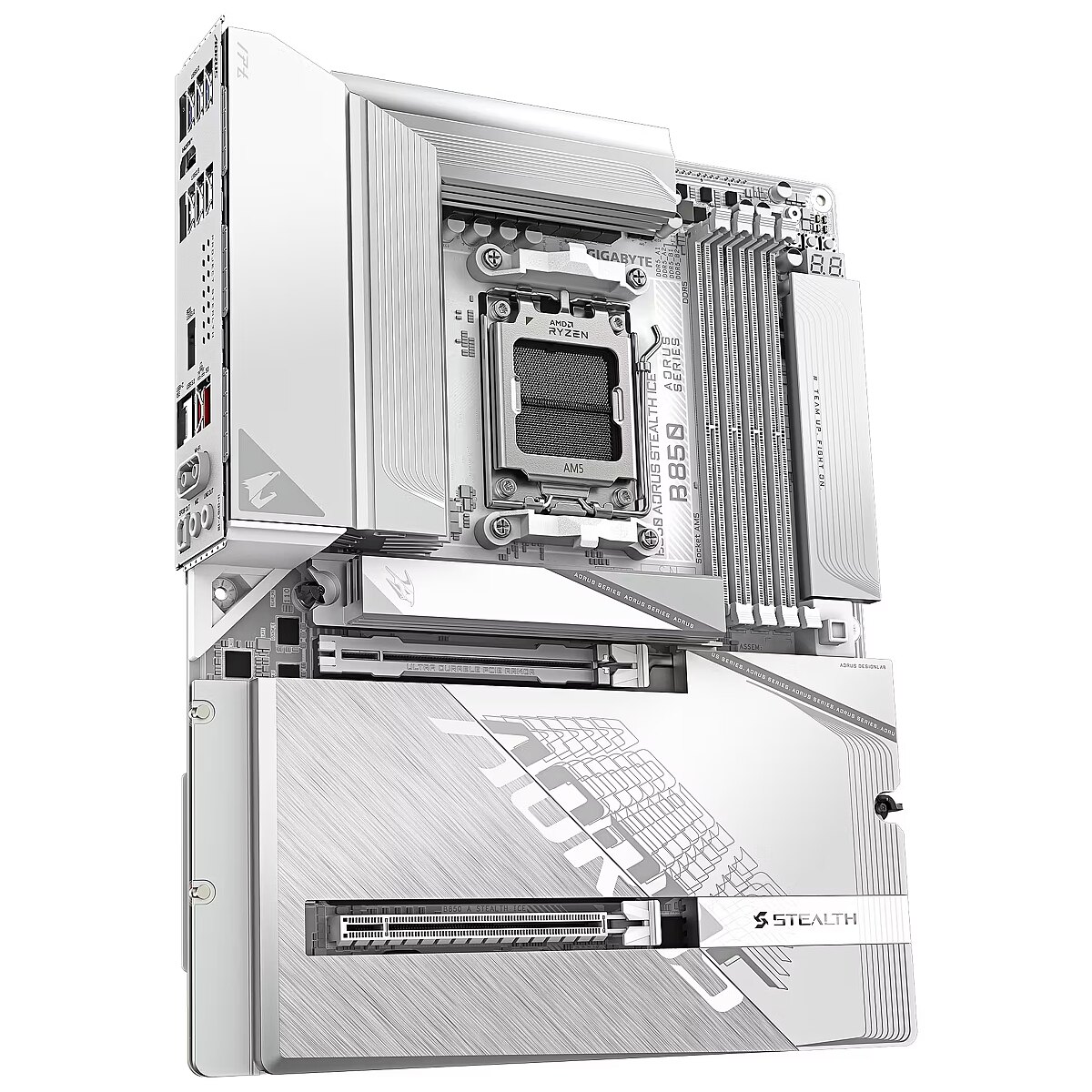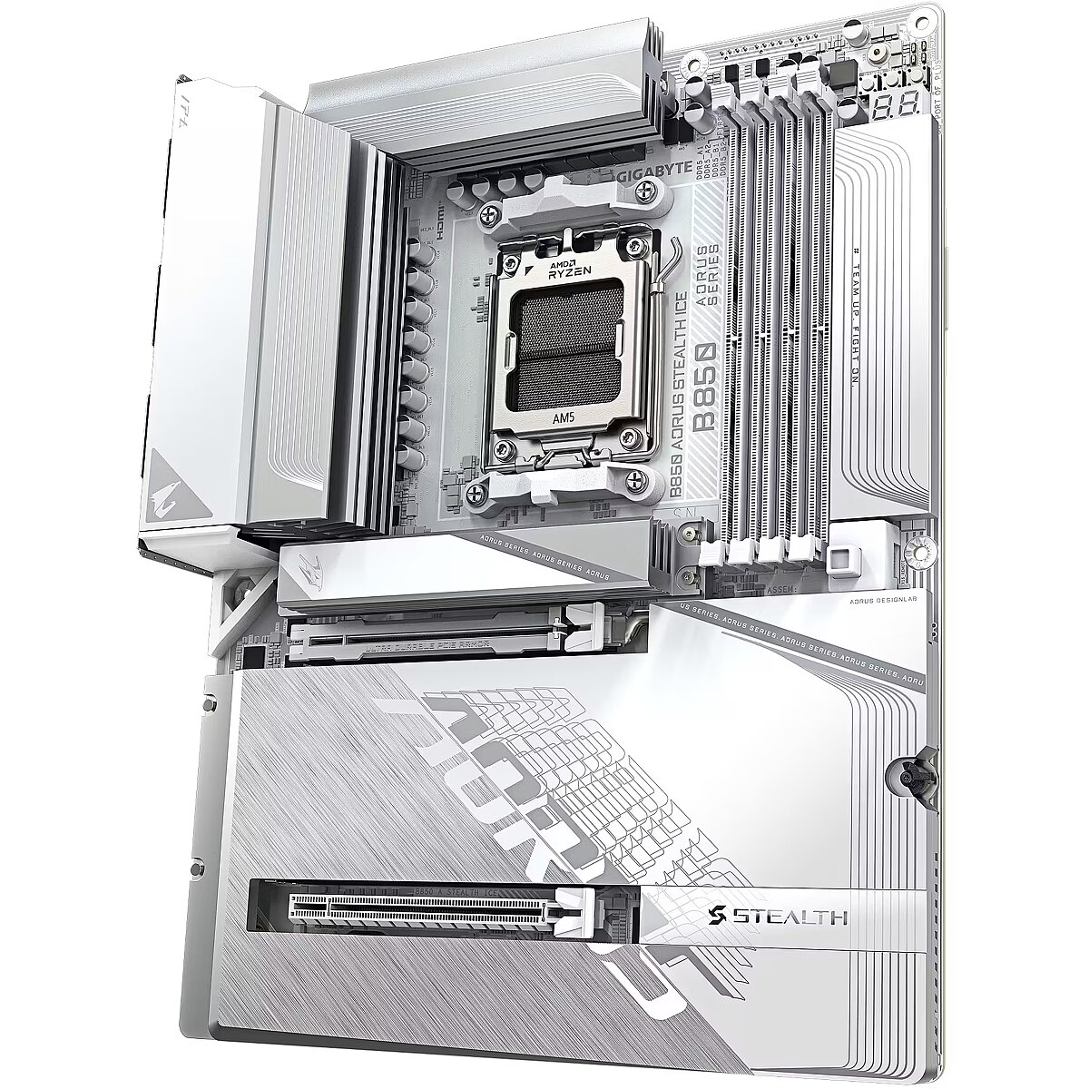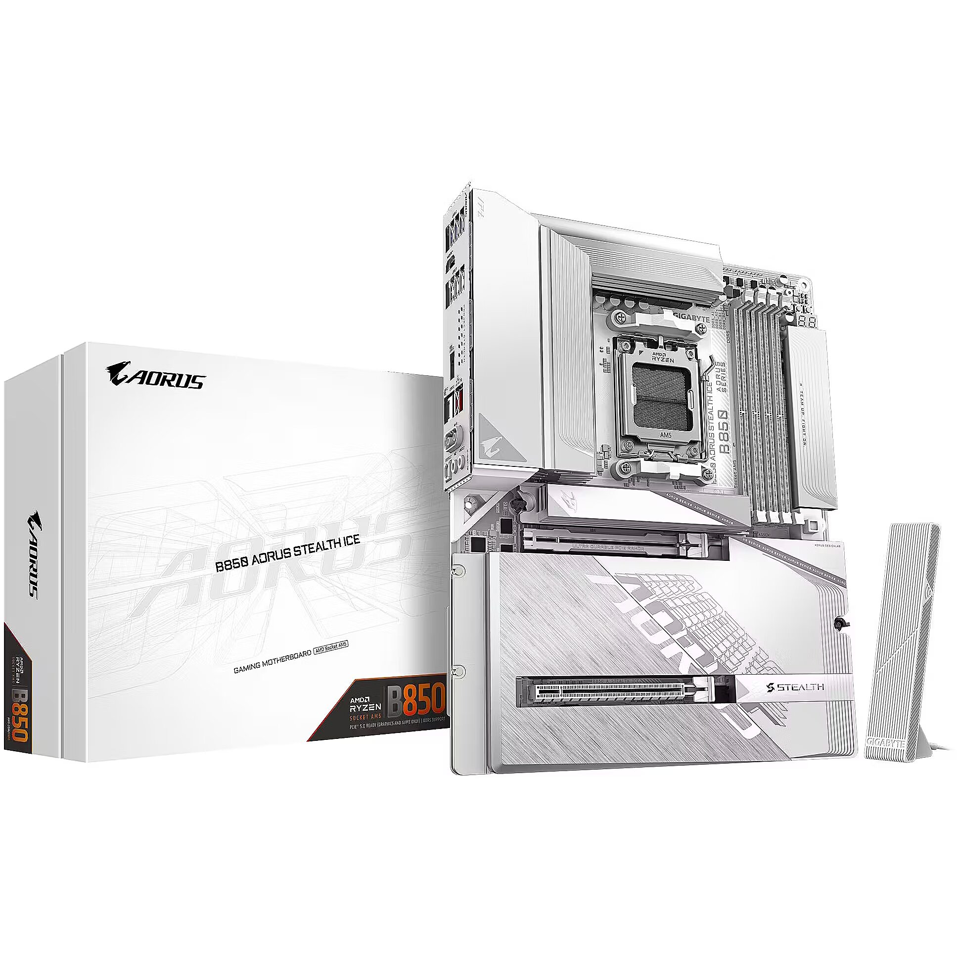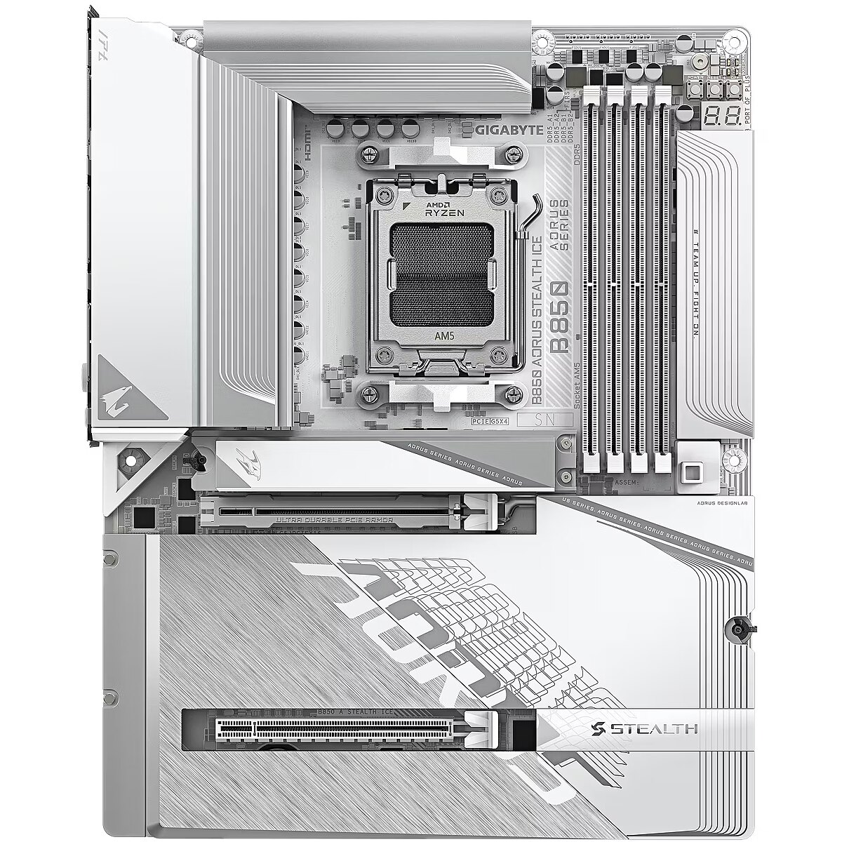 Summary - GIGABYTE B850 AORUS STEALTH ICE Motherboard - AMD Ryzen 9000 Series CPUs, 14+2+2 Phases Digital VRM, up to 8200MHz DDR5 (OC), 2xPCIe 5.0 + 2xPCIe 4.0 M.2, WIFI 7, 5 GbE LAN, USB 3.2 Gen 2. Processor manufacturer: AMD, Processor socket: Socket AM5, Compatible processor series: AMD Ryzen 7000 Series, AMD Ryzen 8000 Series, AMD Ryzen 9000 Series. Supported memory types: DDR5-SDRAM, Maximum internal memory: 256 GB, Memory slots type: DIMM. Supported storage drive interfaces: M.2, PCI Express 4.0, PCI Express 5.0, SATA III, Supported storage drive types: HDD & SSD, RAID levels: 0, 1, 5, 10. Maximum resolution: 4096 x 2160 pixels. Ethernet interface type: 5 Gigabit Ethernet, LAN controller: Realtek RTL8126, Top Wi-Fi standard: Wi-Fi 7 (802.11be)