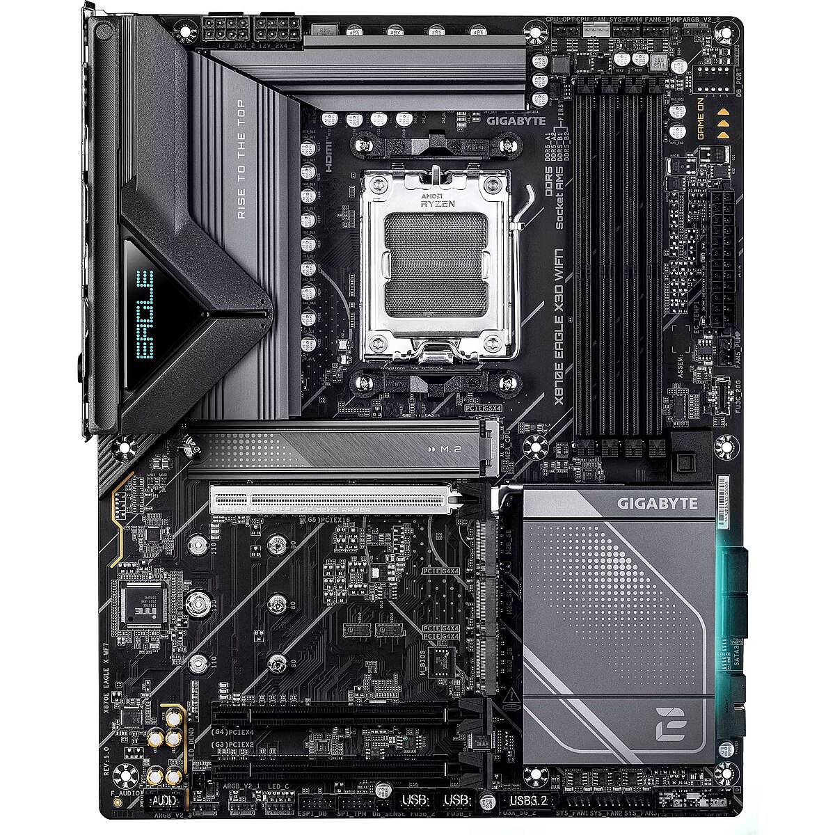ShortSummaryDescription - GIGABYTE X870E EAGLE X3D WIFI7 Motherboard - Supports AMD Ryzen 9000 CPUs, 14+2+2 Phases Digital VRM, up to 9000Hz DDR5 (OC), 1xPCIe 5.0 + 3xPCIe 4.0, Wi-Fi 7, 5GbE LAN, USB 4, AMD, Socket AM5, AMD Ryzen 7000 Series, AMD Ryzen 8000 Series, AMD Ryzen 9000 Series, Socket AM5, DDR5-SDRAM, 256 GB