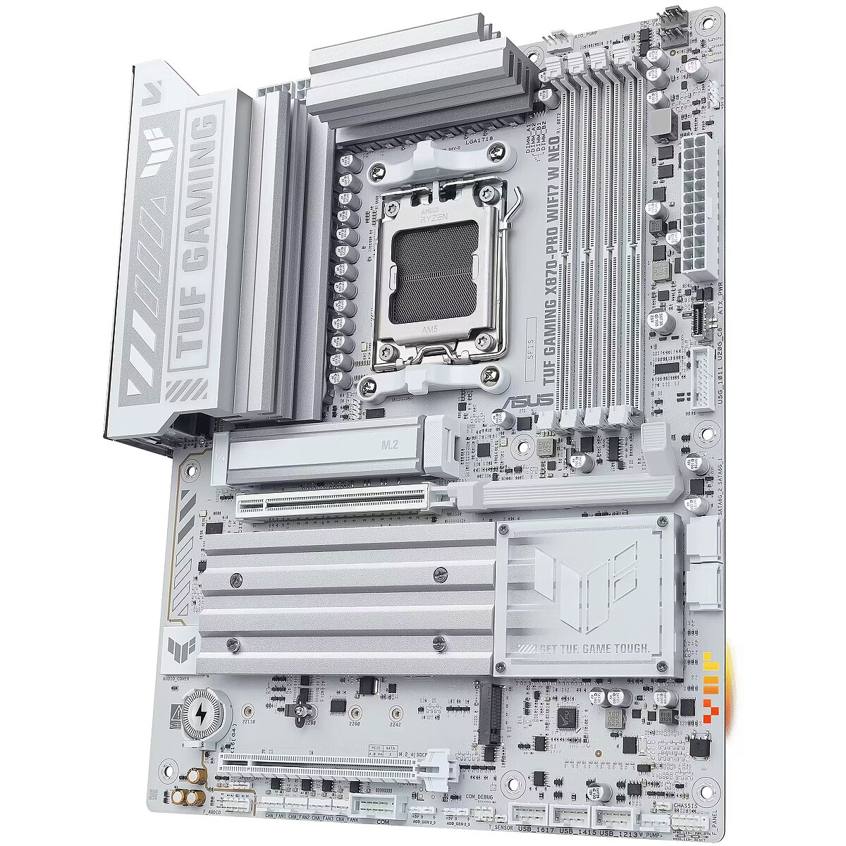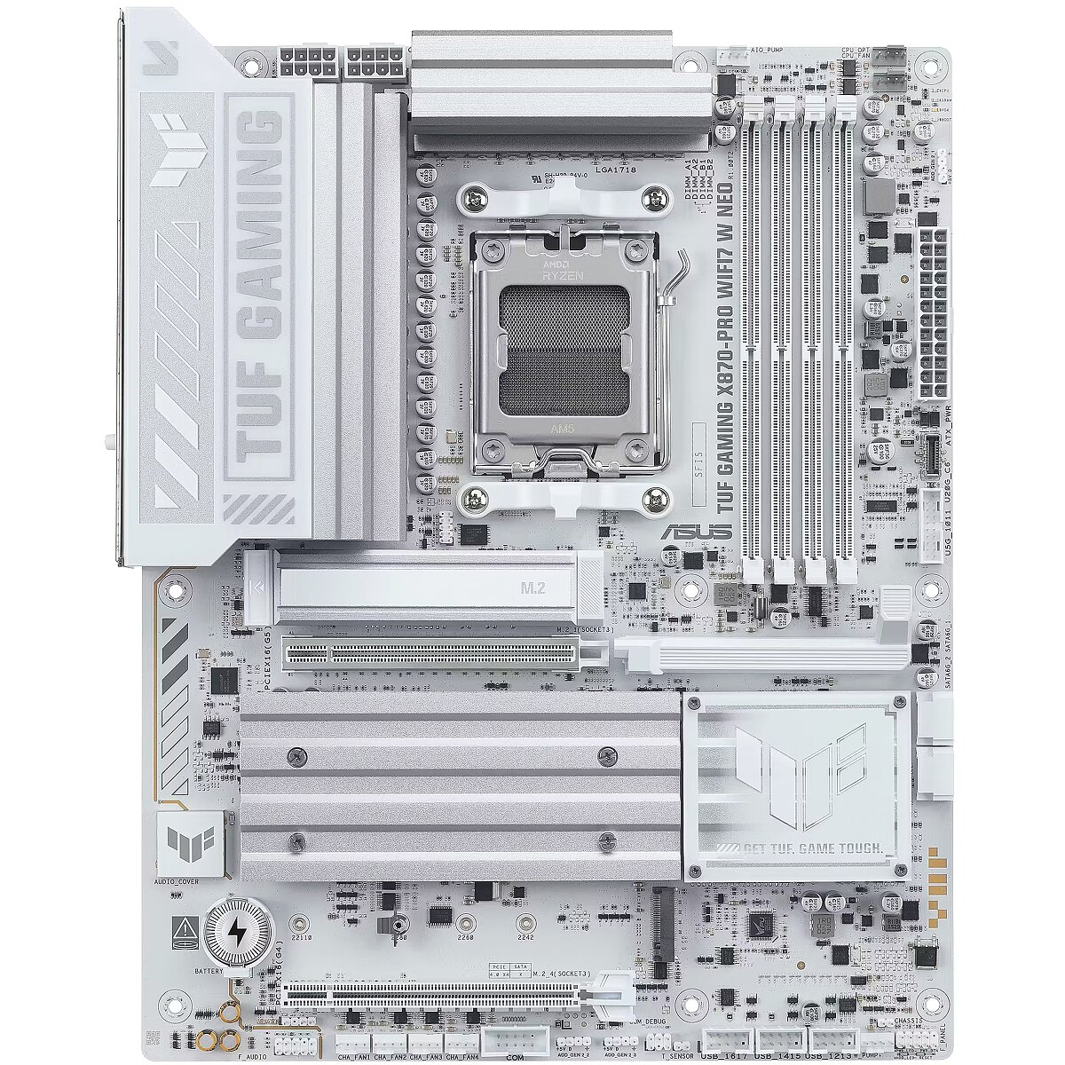 LongDesc - TUF GAMING X870-PRO WIFI7 W NEOASUS TUF GAMING X870-PRO WIFI7 W NEO takes all the essential elements of the latest AMD Ryzen™ processors and combines them with game-ready features and proven durability. Engineered with an upgraded power solution and a comprehensive cooling system, this motherboard goes beyond expectations with rock-solid and stable performance for marathon gaming. TUF GAMING motherboards also undergo rigorous endurance testing to ensure that they can handle conditions where others may fail. This platform delivers the power and connectivity that advanced AI PC applications demand.