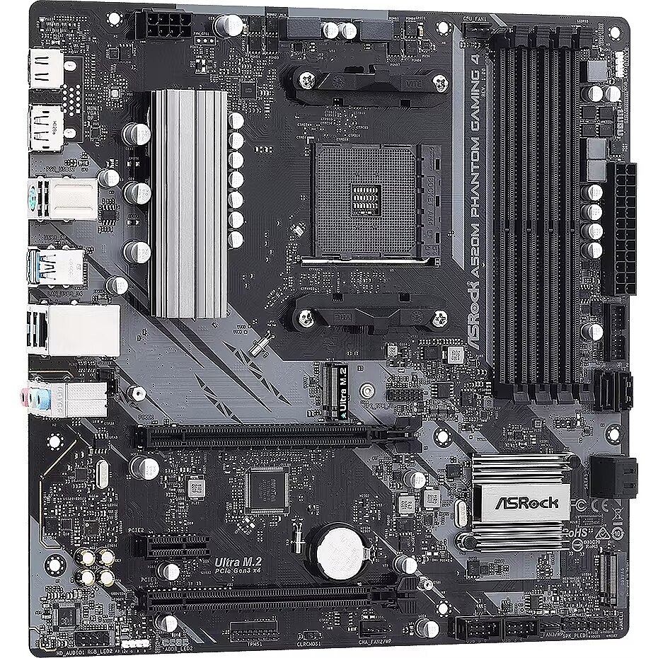 Name - ASRock | A520M PHANTOM GAMING 4 | Processor family AMD | Processor socket AM4 | DDR4 DIMM | Memory slots 4 | Supported hard disk drive interfaces SATA, M.2 | Number of SATA connectors 4 | Chipset AMD A520 | Micro ATX