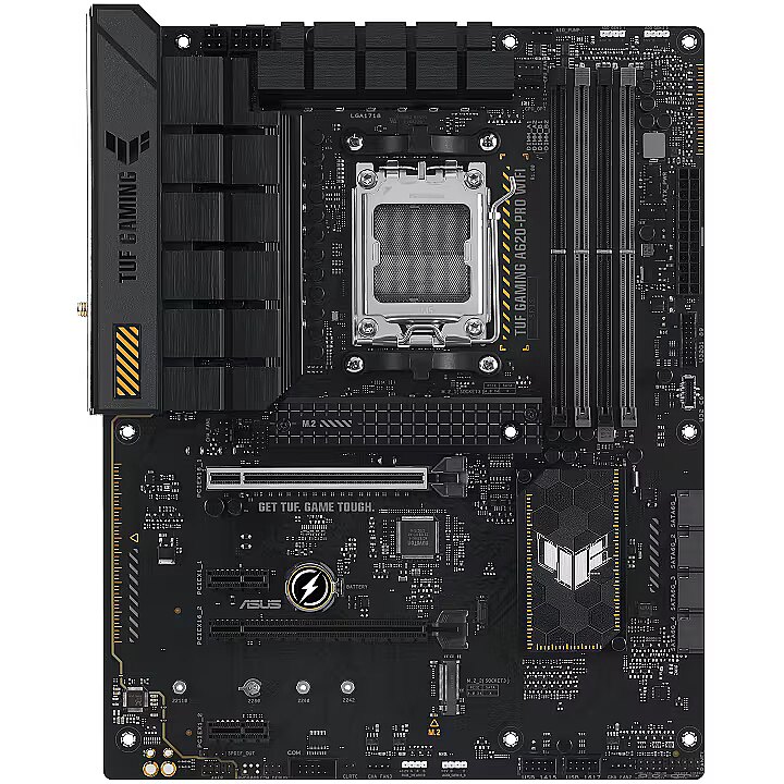 LongDesc - TUF GAMING A620-PRO WIFIASUS TUF GAMING A620-PRO WIFI takes all the essential elements of AMD Ryzen 7000-series processors and combines them with game-ready features and proven durability. Engineered with military-grade components, an upgraded power solution and a comprehensive cooling system, this motherboard goes beyond expectations with rock-solid and stable performance for marathon gaming. TUF GAMING motherboards also undergo rigorous endurance testing to ensure that they can handle conditions where others may fail. Aesthetically, this model incorporates rugged off-black and geometric design elements to reflect the dependability and stability that defines the TUF GAMING series.INTELLIGENT CONTROLComprehensive controls form the foundation of the ASUS TUF GAMING series. The TUF GAMING A620 motherboard packs flexible tools to tune every aspect of your system, enabling performance tweaks to perfectly match the way you work to maximize productivity.All-Around Energy EfficiencyThe Power Saving function contains several settings can easily optimize power consumption and maximize energy savings. You can enable a CPU power limit, darken Aura lighting, and set the fan profile to a power saving mode. You can also toggle the Power Saver plan that is built into Microsoft Windows.ROCK-SOLID PERFORMANCEWith upgraded power delivery and comprehensive cooling options to fuel AMD's CPUs, plus support for faster memory and storage, TUF GAMING A620 motherboards are the perfect foundation for your next high-core-count AMD battle rig.DrMOS Power Stages12+2 power stages are each rated to handle 50 amperes, combining high-side and low-side MOSFETS and drivers into a single package to deliver power, efficiency and stable performance for all compatible AMD processors.EASY PC DIYThe TUF GAMING line offers easy setup for all builders. The TUF GAMING Alliance ecosystem grants compatibility, while Armoury Crate has Fan Xpert 4, hardware info, Two-Way AI Noise Cancelation, RGB options and peripheral settings. This platform has intuitive tools to build and optimize dream rigs.Build With ConfidenceTUF GAMING Alliance is a collaboration between ASUS and trusted PC component brands to ensure compatibility across a wide range of parts, such as PC cases, power supplies, CPU coolers, memory kits and more. With new partnerships and components being added regularly, the TUF GAMING Alliance will continue to grow even stronger.IMMERSIVE GAMINGTUF GAMING A620 motherboards provide a feature-packed high-performance gaming package, with ultrafast networking for smoother online gameplay, pristine audio with positional cues for FPS Gaming, and onboard RGB lighting that syncs with attached gear to personalize your gaming atmosphere.ASUS WebstorageTimeline BackupAuto Backup for Your Computer!ASUS user's special offer. Buy 1TB get 200GB free.THIS CHANGES EVERYTHINGFROM THIS NEW PLATFORM,YOU CAN SEE THE FUTURE