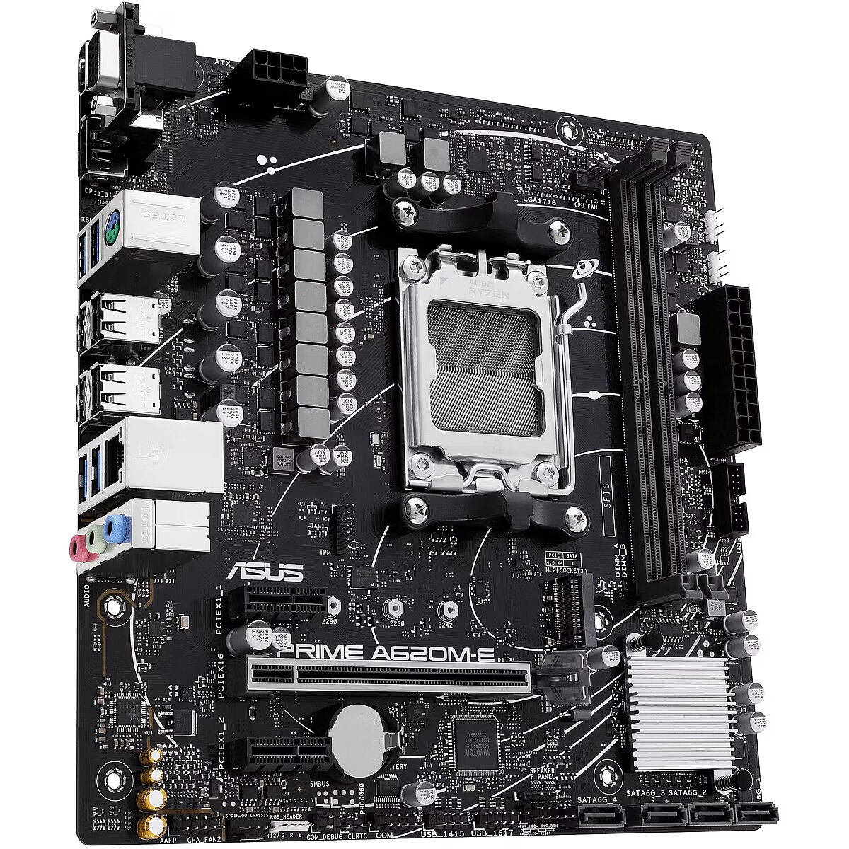 LongSummaryDescription - ASUS PRIME A620M-E-CSM. Processor manufacturer: AMD, Processor socket: Socket AM5, Compatible processor series: AMD Ryzen 7000 Series. Supported memory types: DDR5-SDRAM, Maximum internal memory: 96 GB, Memory slots type: DIMM. Supported storage drive interfaces: M.2, SATA III, Supported storage drive types: HDD & SSD, RAID levels: 0, 1, 10. Ethernet interface type: Gigabit Ethernet. Component for: PC, Motherboard form factor: micro ATX, Motherboard chipset family: AMD