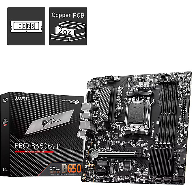ShortSummaryDescription - MSI PRO B650M-P, AMD, Socket AM5, AMD Ryzen 7000 Series, Socket AM5, DDR5-SDRAM, 192 GB