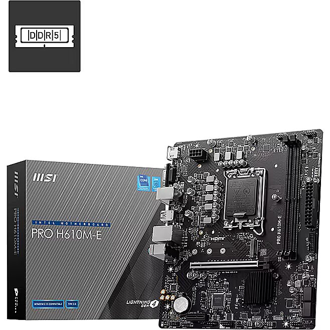 Summary - MSI PRO H610M-E. Processor manufacturer: Intel, Processor socket: LGA 1700, Compatible processor series: Intel® Celeron®, Intel® Core™ i3, Intel® Core™ i5, Intel® Core™ i7, Intel® Core™ i9, Intel Pentium G. Supported memory types: DDR5-SDRAM, Maximum internal memory: 96 GB, Memory slots type: DIMM. Supported storage drive interfaces: M.2, SATA III, Supported storage drive types: HDD & SSD, RAID levels: 0, 1, 5, 10. Ethernet interface type: 2.5 Gigabit Ethernet. Component for: PC, Motherboard form factor: micro ATX, Motherboard chipset family: Intel