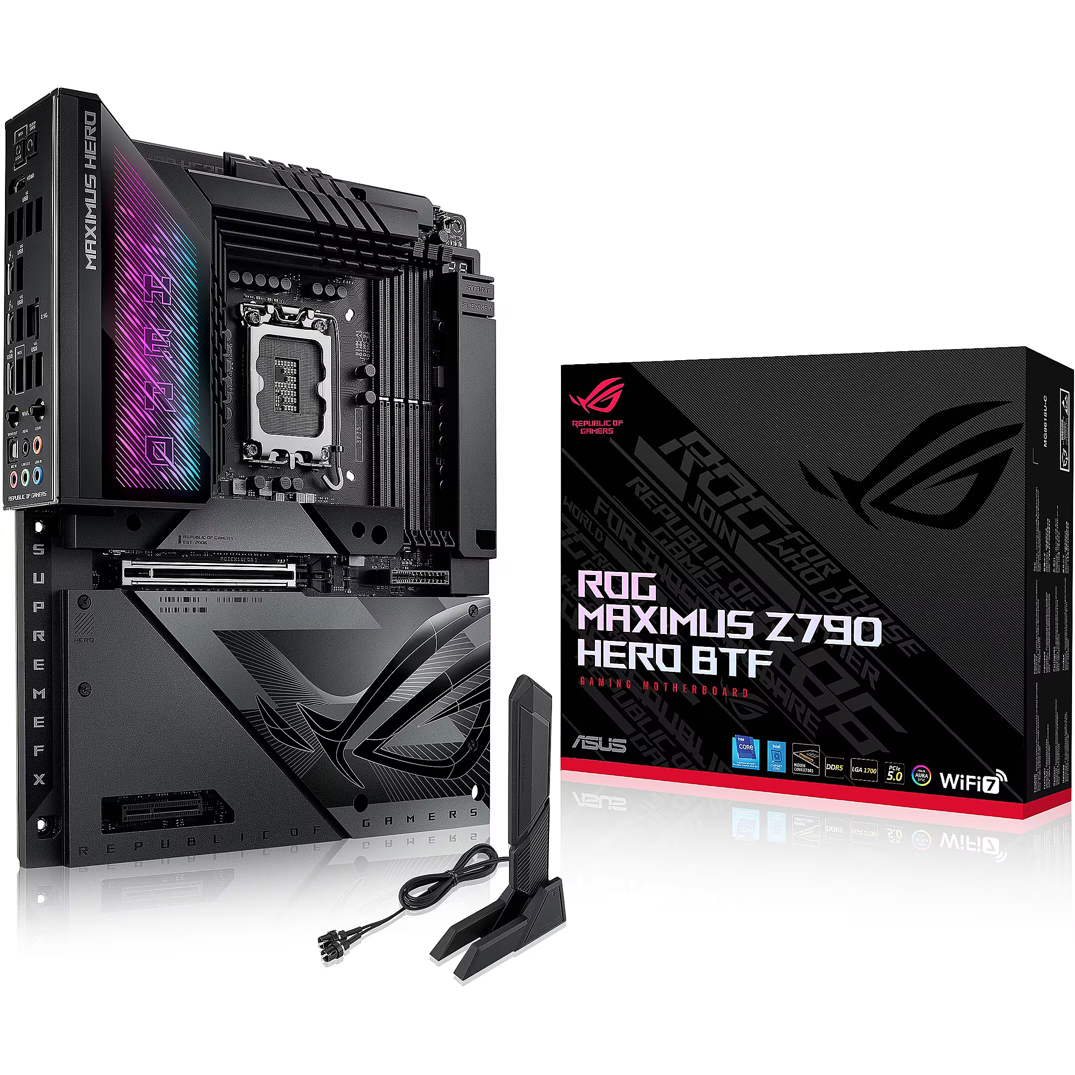LongDesc - ROG Maximus Z790 Hero BTF is the first ROG motherboard with a hidden-connector design and graphics card high-power slot that delivers up to 600 watts of power for BTF graphics cards through the motherboard, providing an unprecedented level of cable management to PC DIY enthusiasts. It also boasts robust cooling, WiFi 7 and ample PCIe® 5.0 slots for unmatched performance, plus full compatibility with 14th Gen Intel® Core™ processors.ADVANCED BTF DESIGNWith the combination of a BTF graphics card, motherboard and chassis, you can enjoy a full hidden-connector experience. This Advanced BTF approach is achieved through the new graphics card high-power slot available on BTF motherboards, which can deliver up to 600 watts to BTF graphics cards. With a full set of BTF components, builders can eliminate visible cables for an extra-clean aesthetic.DIY-FRIENDLY FEATURESPCIE® SLOT Q-RELEASE SLIMWith PCIe® Slot Q-Release Slim, simply tilt the card toward the latching mechanism to automatically unlock it from the PCIe slot. This makes upgrades and maintenance easier than ever before. Users will no longer need to fiddle with a tricky latch or even press a button to release their graphics card from the slot.M.2 Q-LATCHThe innovative Q-Latch makes it easy to install or remove an M.2 SSD without the need for specific tools. The design employs a simple locking mechanism to secure the drive and neatly eliminate traditional screws.Q-ANTENNAWith Q-Antenna, attaching a WiFi antenna to your PC is now easy and fast. Instead of slowly rotating two fasteners until they finally lock in, they just snap into place. Less hassle, and more consistent performance.Q-CODEThe on-board LED panel shows 2-digit diagnostic codes, providing a valuable reference for troubleshooting common boot problems and hardware issues.Q-LEDQ-LED is a set of troubleshooting lights to give PC builders quick indicators to confirm that key components ― CPU, RAM, graphics card, storage devices ― are functioning normally during startup. Q-LED can also alert them when memory modules have not been properly installed--even before attempting to boot a newly built PC.BIOS FLASHBACK™BIOS FlashBack™ is a safe and simple way to update an ASUS BIOS. Just drop the (UEFI) BIOS file onto a FAT32-formatted USB stick, plug it into the USB BIOS FlashBack port, and press the button. Updates can even be performed without having memory or a CPU installed.CLEAR CMOSThe Clear CMOS button quickly resets BIOS settings to factory default. It can also be used to reboot the PC if incorrect BIOS settings have been selected.ROG OVERCLOCKING TECHNOLOGIESPsyche up and engage the Hero BTF overclocker in you, with onboard intelligence to scan, predict and adapt CPU performance parameters, and tools to command and track system vitals.AI OVERCLOCKINGTuning is now faster and smarter than ever before. ASUS AI Overclocking profiles the CPU and cooling to predict the optimal configuration and push the system to its limits. Predicted values can be engaged automatically or used as a launching ground for further experimentation.DIFFERENTIAL SENSINGConventional motherboards use single-ended sensing tapped from a location that isn't ideal, leading to a large disparity between the actual voltage fed to the CPU and the value reported to software. The ROG Maximus Z790 Hero BTF features a differential-sensing circuit and delicate IC that simplify overclocking and tuning by allowing you to track voltages more accurately.TEAMED POWER ARCHITECTUREToday's CPU architectures place incredible demands on motherboard power design by transitioning from deep power-saving modes, going from lower-power mode to full load in an instant. The latest ROG VRM architecture rises to the challenge by utilizing teamed power stages to rapidly swing current, while maintaining exemplary thermal performance.ASUS became the first manufacturer to implement phase-doublers with the A8N32-SLI Deluxe motherboard, back in 2005. The board's VRM was lauded for elegantly overcoming the power handling capabilities of components that were available at the time while also reducing voltage ripple. Those benefits led to phase-doublers becoming universally accepted in the industry, and they are still used for similar purposes today.Modern CPUs pack more cores than their predecessors, and the latest instruction sets allow them to crunch computationally dense workloads at an incredible pace. In addition, they consume less power at idle and can transition between load states much more quickly. These improvements necessitate a re-evaluation of power-design priorities because phase-doublers add a propagation delay that hampers transient response.Fortunately, the latest integrated power components can handle higher currents than the devices of yesteryear, making it possible to implement a simple circuit topology that isn't hamstrung by the processing lag of phase-doublers. That's why the ROG Maximus Z790 Hero BTF utilizes teamed power stages to deliver higher burst current per phase, while maintaining the thermal performance of phase-doubled designs.Each VRM component serves a specific purpose. PWM controllers and phase-doublers control the circuit, and the power stages do the heavy lifting from an electrical and thermal standpoint. The power stages feature low RDSON to reduce switching and conduction losses, helping to improve overall thermal headroom.MEMORYComprehensive memory tuning options are the cornerstone of ROG motherboards. With the ROG Maximus Z790 Hero BTF, you can extract all of the potential out of your DDR5 modules, regardless of if they're from an extreme-speed kit or an entry-level set that would otherwise be locked.ROG has a long legacy of flexing the fastest memory performance, and DDR5 is no outlier. Thanks to improved signal routing, now enthusiast-grade kits have been driven far beyond the 8 GT/s mark on the Maximus Z790 Hero BTF, and who knows how far future DIMMs can go? Seasoned veterans can 