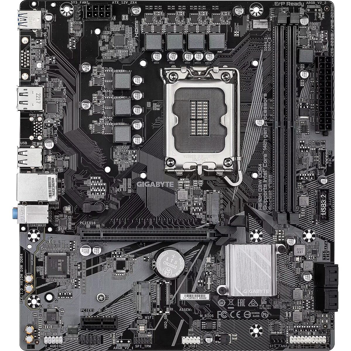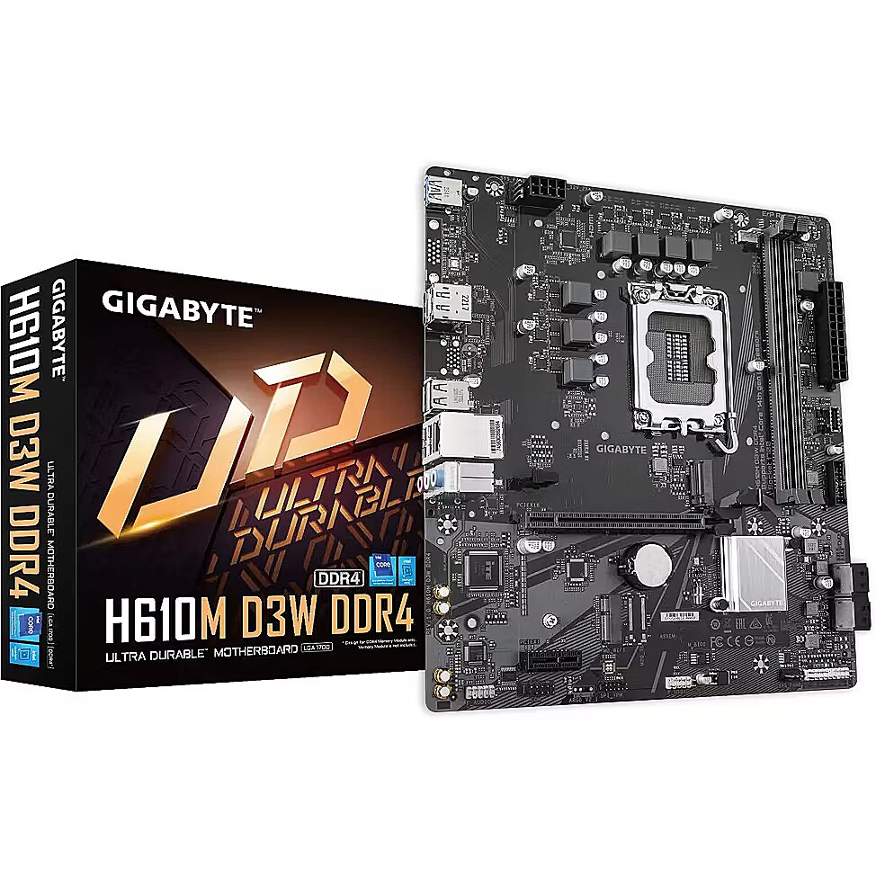LongSummaryDescription - GIGABYTE H610M D3W DDR4 Motherboard - Supports 14th Gen. Intel Core CPUs, 5+1+1 phases VRM, up to 3200MHz DDR4, 1xPCIe 3.0 M.2, 1GbE LAN, USB 3.2 Gen 1. Processor manufacturer: Intel, Processor socket: LGA 1700, Compatible processor series: Intel® Celeron®, Intel Core i3 12th Gen, Intel Core i3 13th Gen, Intel Core i3 14th Gen, Intel.... Supported memory types: DDR4-SDRAM, Maximum internal memory: 64 GB, Memory slots type: DIMM. Supported storage drive interfaces: M.2, SATA III, Supported storage drive types: HDD & SSD. Ethernet interface type: Gigabit Ethernet, LAN controller: Realtek RTL8111H. Component for: PC, Motherboard form factor: micro ATX, Motherboard chipset family: Intel