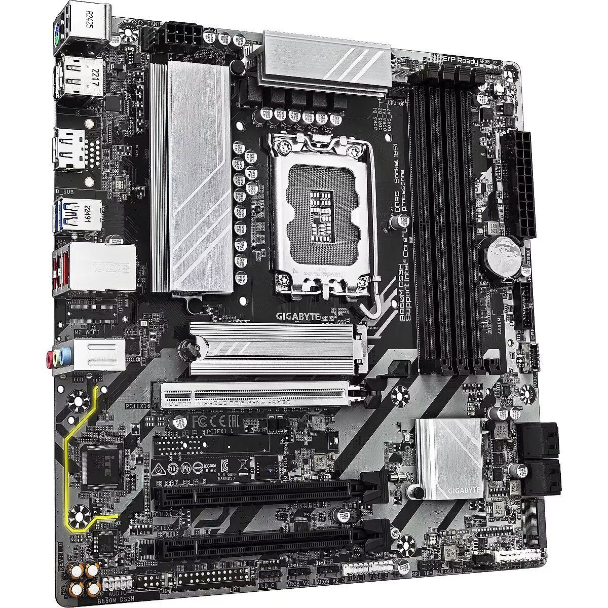 ProductName - B860M DS3H Motherboard - Intel Core Ultra Series CPUs, 5+1+2+1 Phases VRM, up to 9066MHz DDR5, 1xPCIe 5.0 + 1xPCIe 4.0 M.2, 2.5GbE LAN, USB 3.2 Gen 2