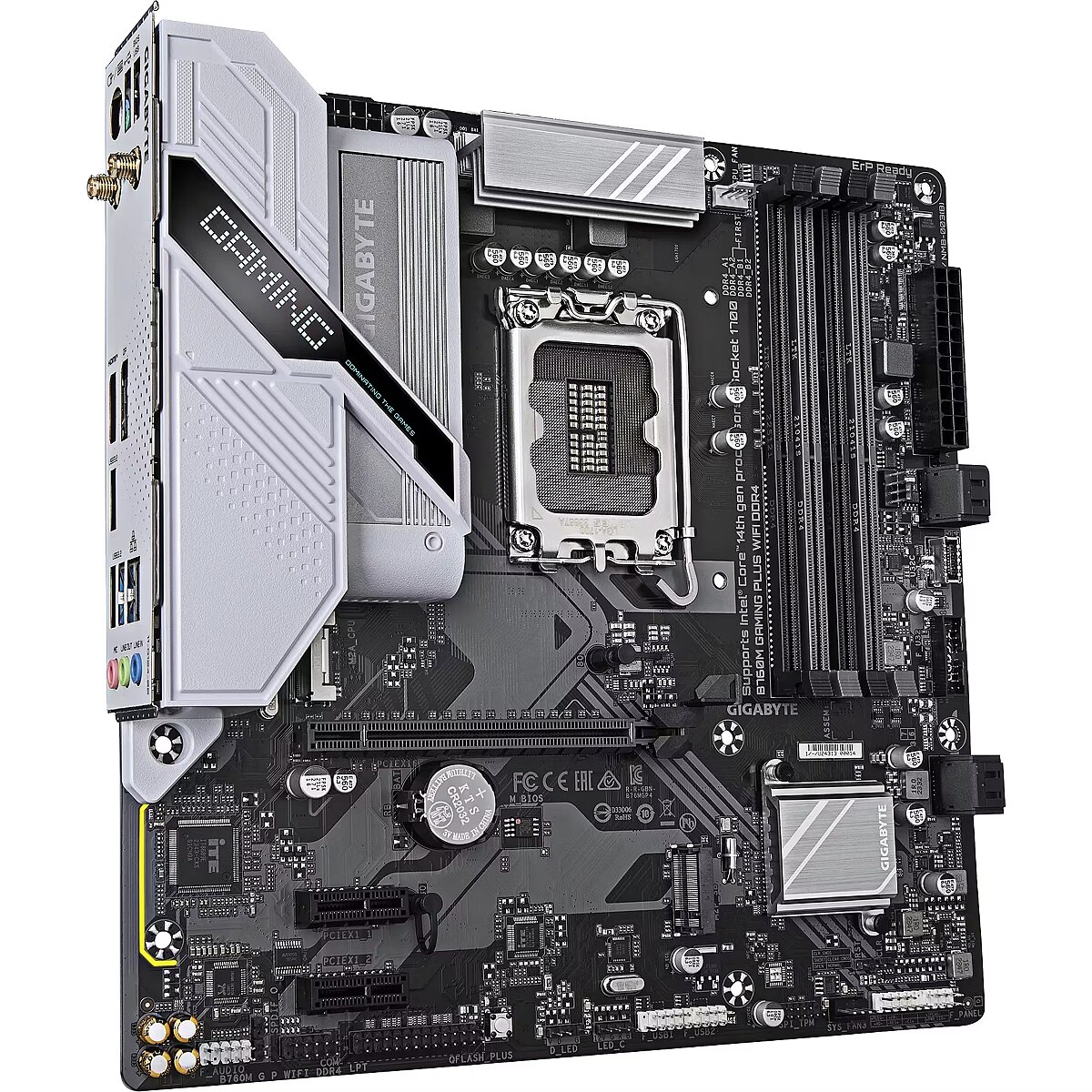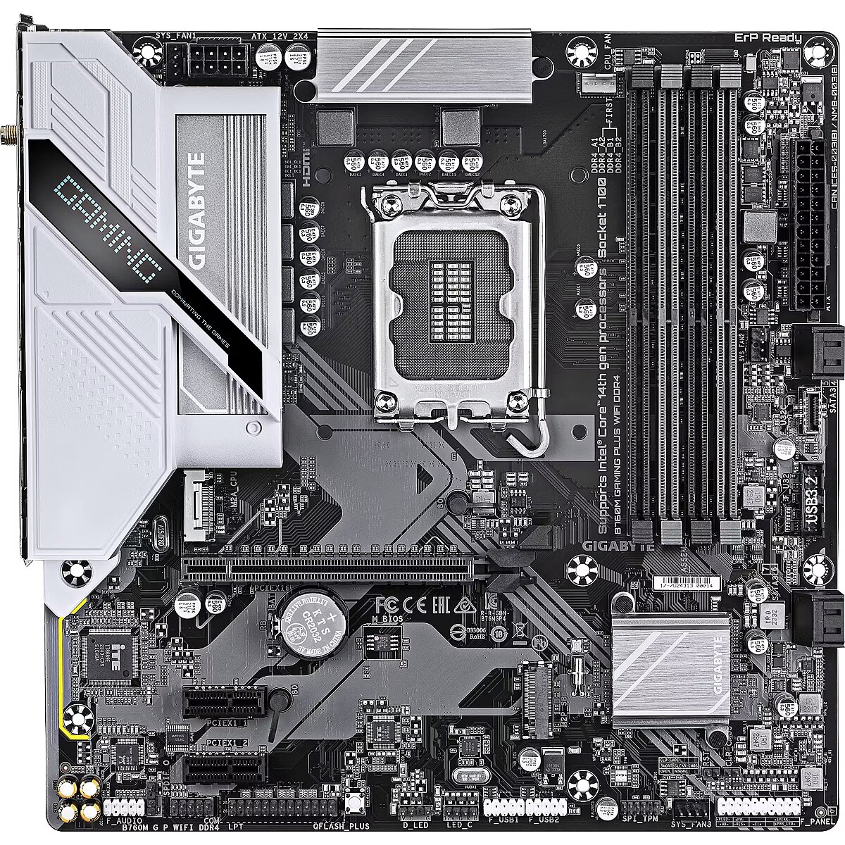 LongSummaryDescription - GIGABYTE B760M GAMING PLUS WIFI DDR4 Motherboard - Supports 14th Gen. Intel Core CPUs, 4+1+1 phases VRM, up to 5333MHz DDR4 (OC), 2xPCIe 4.0 M.2, Wi-Fi 6, 1 GbE LAN, USB 3.2 Gen 1. Processor manufacturer: Intel, Processor socket: LGA 1700, Compatible processor series: Intel® Celeron®, Intel Core i3 12th Gen, Intel Core i3 13th Gen, Intel Core i3 14th Gen, Intel.... Supported memory types: DDR4-SDRAM, Maximum internal memory: 128 GB, Memory slots type: DIMM. Supported storage drive interfaces: M.2, SATA III, Supported storage drive types: HDD & SSD, RAID levels: 0, 1, 5, 10. Maximum resolution: 4096 x 2304 pixels. Ethernet interface type: Gigabit Ethernet, LAN controller: Realtek RTL8111H, Top Wi-Fi standard: Wi-Fi 6 (802.11ax)