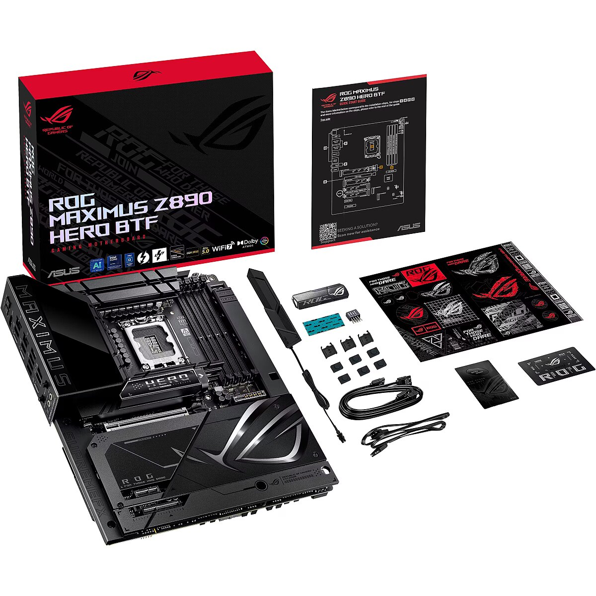 LongSummaryDescription - ASUS ROG MAXIMUS Z890 HERO BTF. Processor manufacturer: Intel, Processor socket: LGA 1851 (Socket V1), Compatible processor series: Intel Core Ultra (Series 2). Supported memory types: DDR5-SDRAM, Maximum internal memory: 256 GB, Memory slots type: DIMM. Supported storage drive interfaces: M.2, SATA III, Supported storage drive types: HDD & SSD, RAID levels: 0, 1, 5, 10. Ethernet interface type: 2.5 Gigabit Ethernet, 5 Gigabit Ethernet, Top Wi-Fi standard: Wi-Fi 7 (802.11be), Wi-Fi standards: Wi-Fi 7 (802.11be). Component for: PC, Motherboard form factor: ATX, Motherboard chipset family: Intel