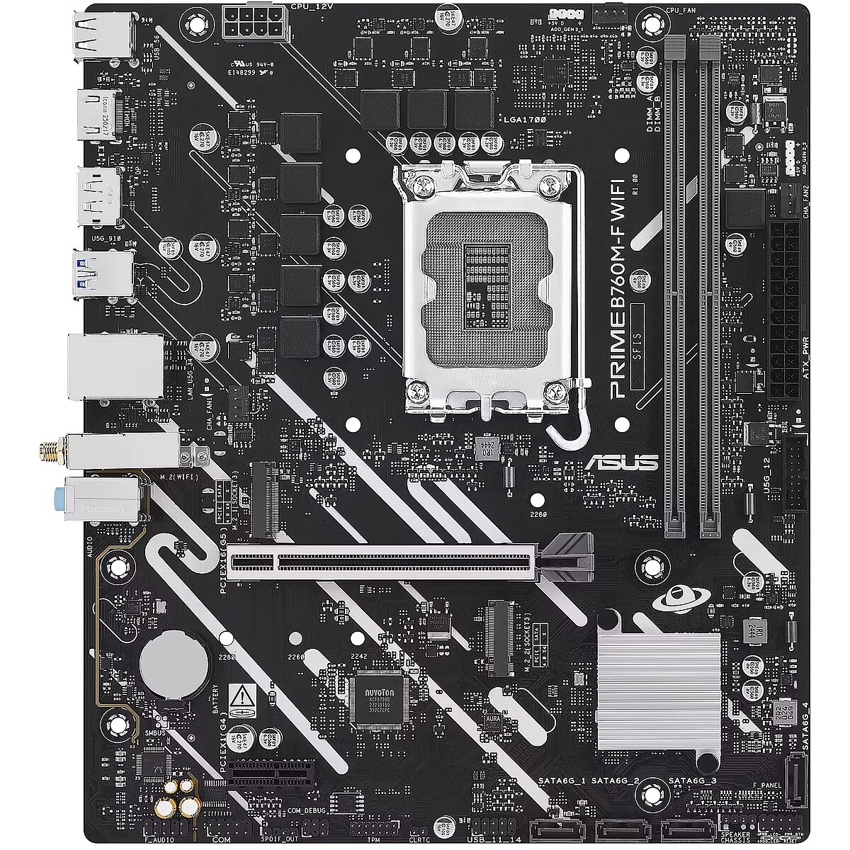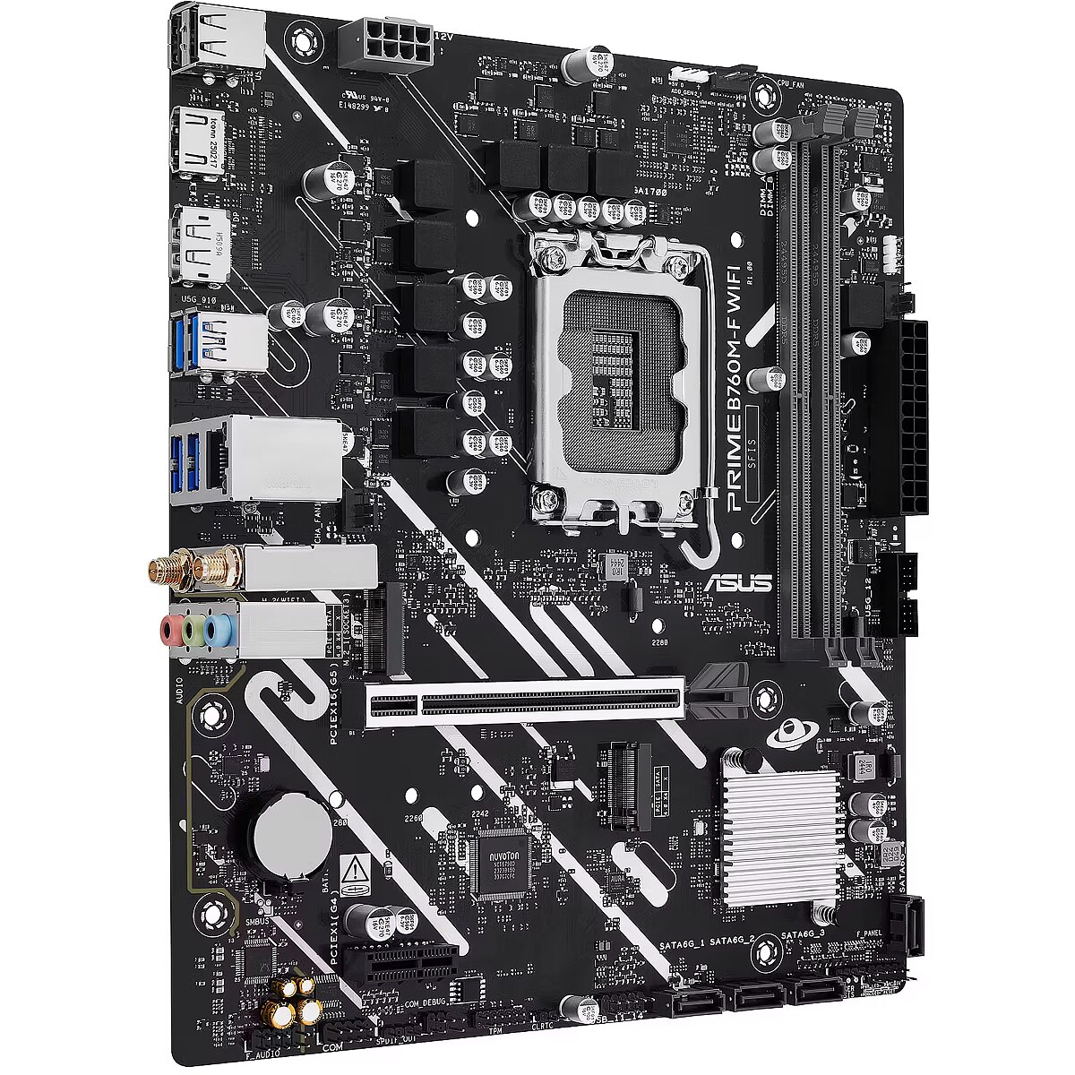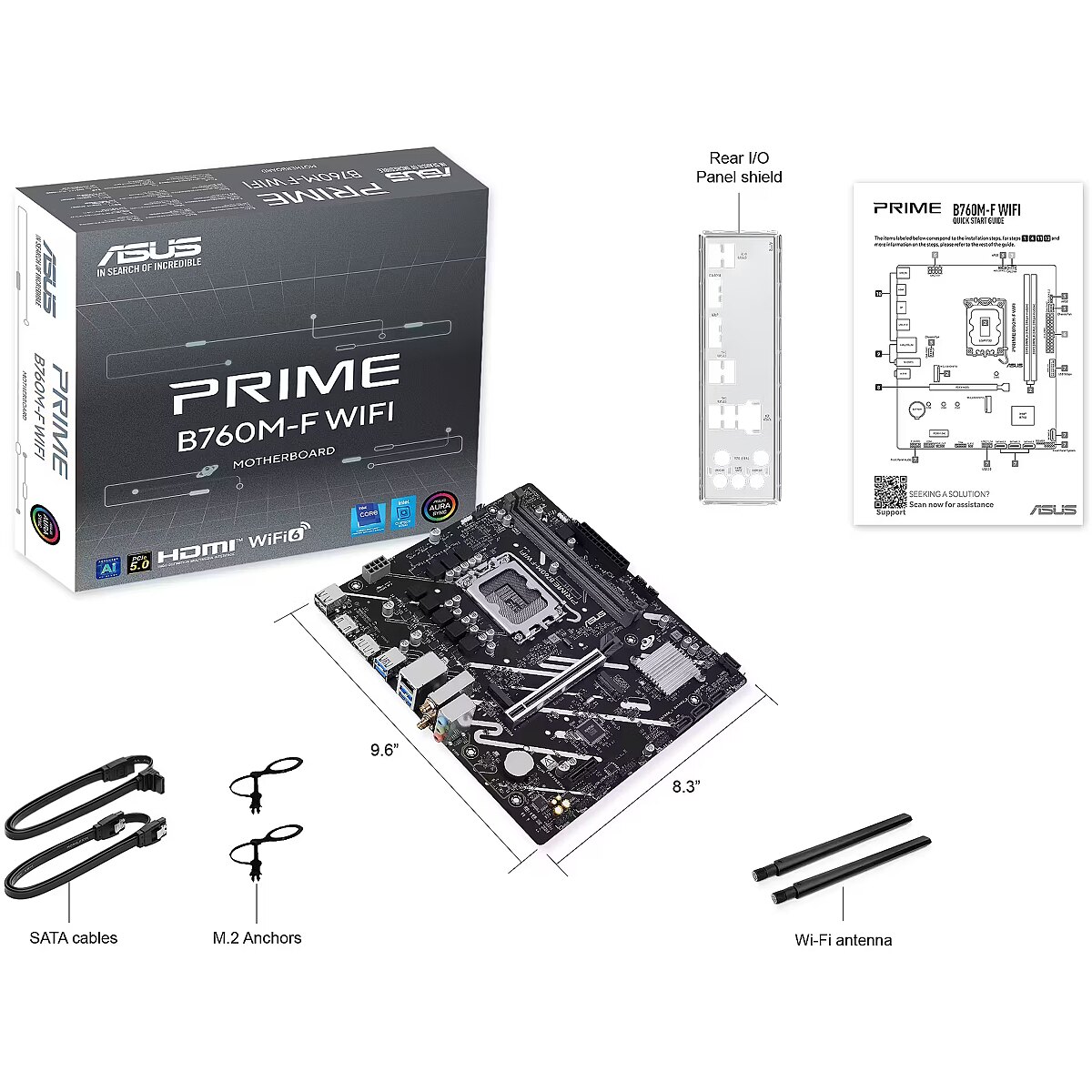 LongSummaryDescription - ASUS PRIME B760M-F WIFI. Processor manufacturer: Intel, Processor socket: LGA 1700, Compatible processor series: Intel® Celeron®, Intel® Pentium® Gold, Intel® Core™ i3, Intel® Core™ i5, Intel® Core™.... Supported memory types: DDR5-SDRAM, Maximum internal memory: 96 GB, Memory slots type: DIMM. Supported storage drive interfaces: M.2, SATA III, Supported storage drive types: HDD & SSD, RAID levels: 0, 1, 5, 10. Ethernet interface type: 2.5 Gigabit Ethernet, Top Wi-Fi standard: Wi-Fi 6 (802.11ax). Component for: PC, Motherboard form factor: micro ATX, Motherboard chipset family: Intel