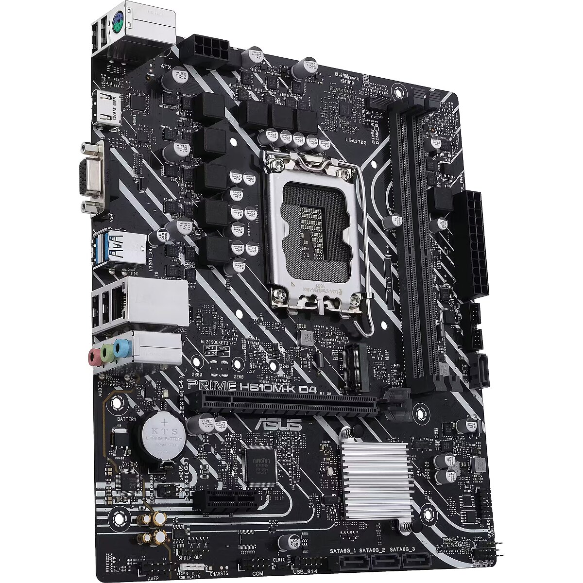 Description - PRIME H610M-K D4 Intel® H610 (LGA 1700) mic-ATX motherboard with DDR4, PCIe 4.0, M.2 slot, Realtek 1 Gb Ethernet, HDMI®, D-Sub, USB 3.2 Gen 1 ports, SATA 6 Gbps, COM header, RGB header Intel® LGA 1700 socket: Ready for 12th Gen Intel® processors Comprehensive cooling: PCH heatsink and Fan Xpert Ultrafast connectivity: 32Gbps M.2 slot, Realtek 1 Gb Ethernet and USB 3.2 Gen 1 support 5X Protection III: Multiple hardware safeguards for all-round protection