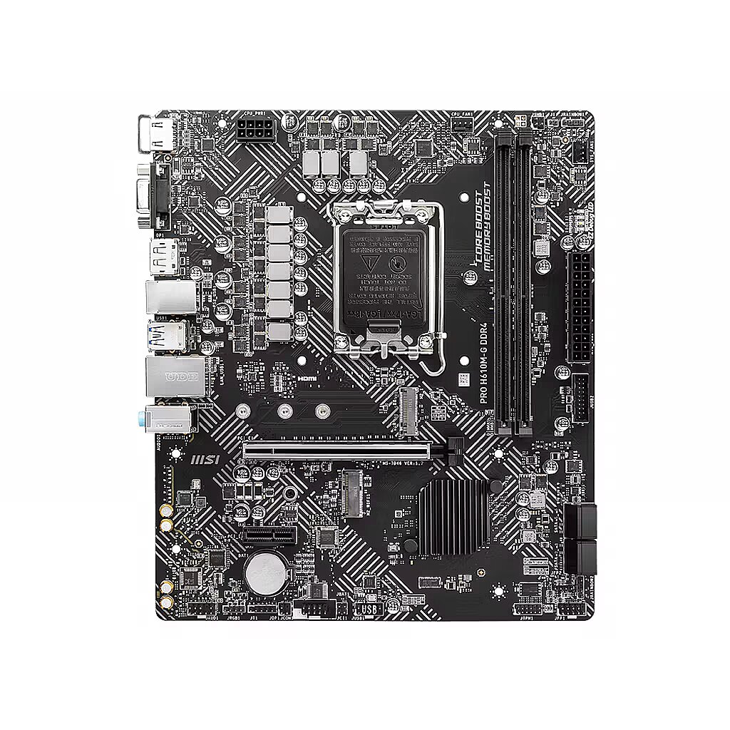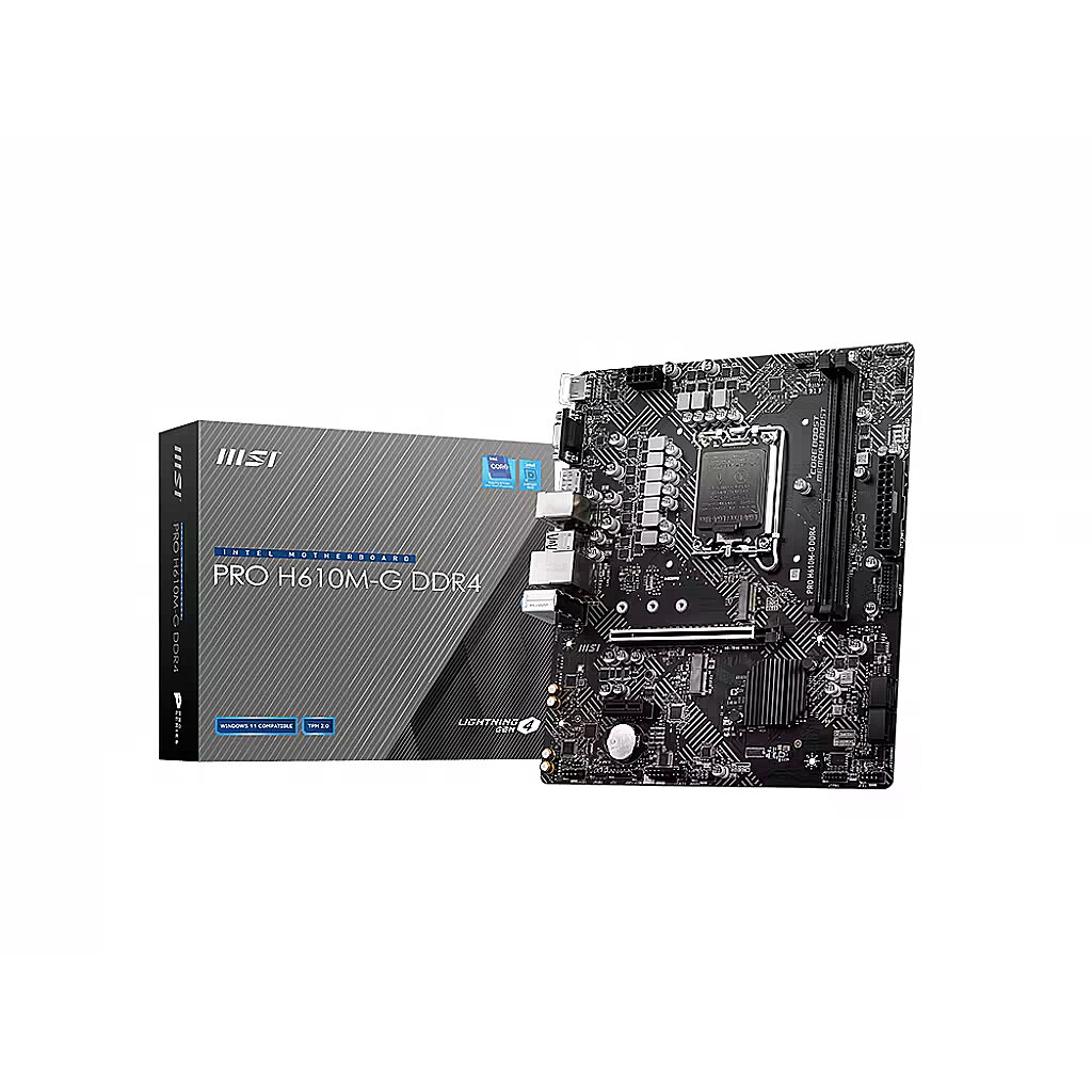 Description - PRO H610M-G DDR4 motherboard Supports Intel 12th generation Core, Pentium Gold and Celeron processors for LGA 1700 socket Supports DDR4 memory, up to 3200 (MAX.) MHz Core Boost: premium chip that supports more cores for better performance Memory boost: advanced technology to deliver clean data signals for best performance, stability and compatibility Lightning-fast performance: PCIe 4.0 Audio Boost: reward your ears with studio quality audio Steel Armor: protects VGA cards from bending and electromagnetic interference for better performance, stability and durability.