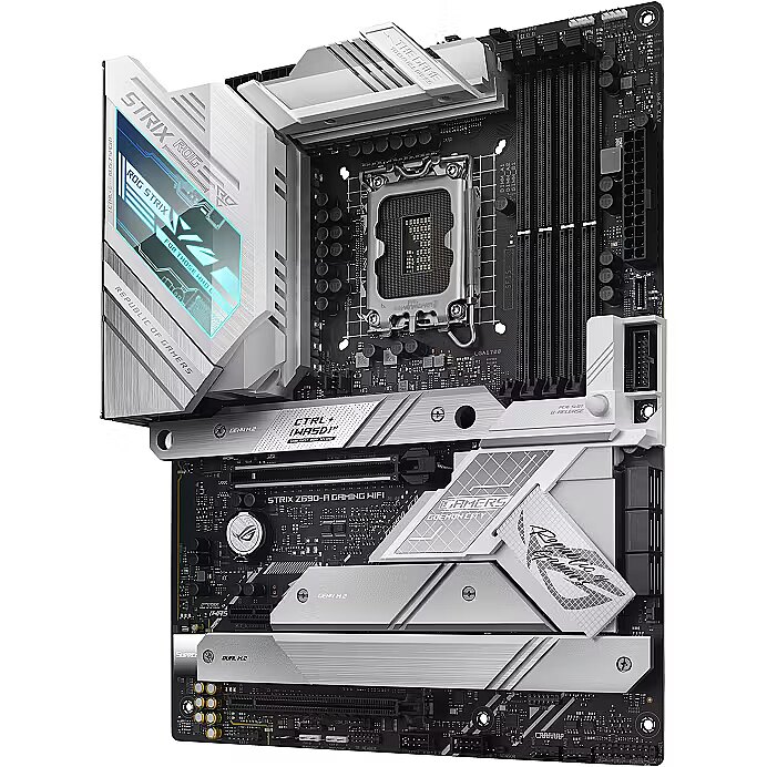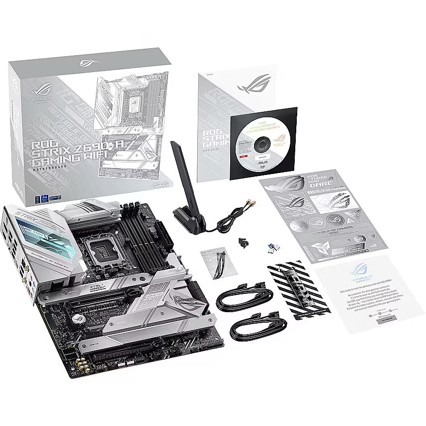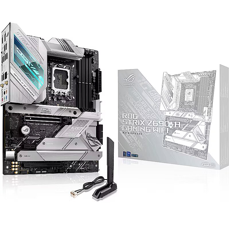 LongDesc - Intel® Z690 LGA 1700 ATX motherboard with PCIe® 5.0, 16+1 DrMos, DDR5, Two-Way AI Noise Cancelation, AI Overclocking, AI Cooling, AI Networking, WiFi 6E, Intel 2.5 Gb Ethernet, four M.2 slots with heatsinks PCIe 4.0 NVMe® SSD support, M.2 backplate, USB 3.2 Gen 2x2 Type-C®, SATA and AURA Sync RGB lightingThe ROG Strix Z690-A Gaming WiFi motherboard deploys robust power delivery and cooling to unleash the full force of 12th Gen Intel® Core™ processors, all orchestrated by ASUS-exclusive intelligent controls that deliver advanced user experiences. Meanwhile, support for DDR5 memory and PCIe® 5.0 video cards will put users on the cutting edge of high-performance PC tech. Onboard WiFi 6E and ample PCIe 4.0 M.2 slots bring the speed that you need, and DIY-friendly innovations help simplify the PC building process. To top it all off, Strix Z690-A Gaming WiFi dazzles with customizable RGB lighting and a refined brushed-metal finish.POWER DESIGNDigital power control and an array of power stages provide the muscle needed to control the latest Intel CPUs.TEAMED POWER STAGES16+1 power stages combine high-side and low-side MOSFETS and drivers into a single package, delivering power and efficiency that the latest Intel processors can take full advantage of.ALLOY CHOKES AND DURABLE CAPACITORSHigh-end chokes and durable capacitors are engineered to resist extreme temperatures, enabling performance that exceeds industry standards.8+8 PIN PROCOOL II POWER CONNECTORASUS ProCool II connectors are built to tight specifications to ensure full contact with power supply cable wiring. A metal sheath improves heat dissipation, and low electrical impedance helps prevent hotspots and bolsters reliability.DIGI+ POWER CONTROLThe Digi+ voltage-regulator module (VRM) is one of the finest in the industry, ensuring ultra-smooth and clean power delivery to the CPU.SIX-LAYER PCBA multi-layered printed circuit board design quickly dissipates heat around the voltage regulators to improve overall system stability and provide the CPU with more overclocking headroom.CoolingIntegrated I/O Cover & VRM HeatsinksTwo thick heatsinks that are bonded to the metal I/O shield cool the VRMs. This structure provides ample mass and surface area to deal with the thermals of Intel’s latest processors.Thermal PadsSpecially engineered thermal pads efficiently transfer heat from the inductor and phase array to the heatsink.Intelligent ControlTWO-WAY AI NOISE CANCELATIONTThis powerful ASUS-exclusive utility leverages a massive deep-learning database to reduce background noise from the microphone* and incoming audio while preserving voices. Distracting keyboard clatter, mouse clicks and other ambient noises are removed so you can hear and be heard with perfect clarity while gaming or during calls.*A splitter cable is necessary when using a 3.5 mm headset.ROG AI OVERCLOCKINGROG AI Overclocking is an intelligent utility that helps you get the most out of your build by automatically profiling your CPU and cooling system to predict optimal voltage and frequency settings.Accessible via the AI Suite software in Windows or directly through the UEFI, the intuitive AI Overclocking user interface enables users of all levels. A range of customizable settings are available for seasoned overclockers, and an auto-tuning option is available for beginners.AI COOLINGASUS AI Cooling technology automatically manages and controls motherboard-connected fans to ensure optimal settings based on current system load and temperature.AI NETWORKINGThe proprietary ROG GameFirst VI utility is designed to help all users — beginners, experts, and everyone in between — optimize network settings to ensure smooth online gameplay. New to this generation, GameFirst VI features AI-enhanced identification and boost technologies to ensure faster and smarter network optimization.Storage & MemoryDDR5 Overclocking StrengthComprehensive memory tuning options are the cornerstone of ROG motherboards. For DDR5, the Maximus Z690 lineup breaks performance limits by providing a stacked suite of overclocking parameters for not only high-speed kits, but even entry-level memory modules that have a locked power management IC (PMIC).- A dedicated circuit on the motherboard safely circumvents DDR5 memory PMIC restrictions, allowing you to step past the default 1.1-volt limit and push frequency and timings to the max.- Ordinarily, a restricted PMIC that has been unlocked requires the system to be fully power-cycled each time memory voltage is adjusted. ROG motherboards leverage onboard hardware and firmware to cleverly work around this irksome limitation, enabling voltage adjustments to be applied through the same soft system-reset process employed for previous generations of DDR memory.PCIe PerformanceWith four strategically placed M.2 slots, ROG Strix Z690-A Gaming WiFi takes full advantage of CPU and chipset bandwidth to usher in support for dizzyingly quick PCIe® Gen 4.0 SSDs, lightning-fast Intel NVM Express® RAID, and high-capacity drives that blaze past traditional SATA-based storage.NetworkingWIFI 6E (802.11 AX)Onboard WiFi 6E technology takes advantage of the newly available radio spectrum in the 6 GHz band. It provides up to three times the bandwidth of the 5 GHz band and up to seven 160 MHz bands to deliver ultrafast wireless networking speeds and improved capacity as well as better performance in dense wireless environments.*WiFi 6E availability and features are dependent on regulatory limitations and co-existence with 5 GHzIntel 2.5 Gb EthernetOnboard 2.5 Gb Ethernet gives your wired connection a boost, with up to a 2.5X improvement over standard Ethernet connections for faster file transfers, smoother lag-free gaming and high-res video streaming.AudioSUPREMEFXROG SupremeFX is a unique blend of hardware and software that provides superior audio. In ROG Strix Z690-A Gaming WiFi, SupremeFX features the ALC4080 codec to increase playback resolution from 192 kHz to 
