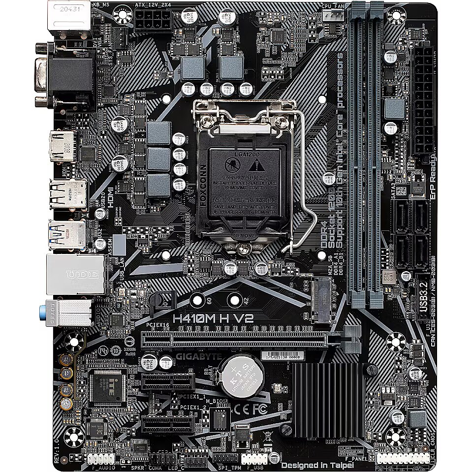 ShortSummaryDescription - GIGABYTE H410M H V2 Motherboard - Supports Intel Core 10th CPUs, up to 2933MHz DDR4, 1xPCIe 3.0 M.2, GbE LAN, USB 3.2 Gen 1, Intel, LGA 1200 (Socket H5), Intel® Celeron®, Intel® Core™ i3, Intel® Core™ i5, Intel® Core™ i7, Intel® Core™ i9, Intel® Pentium®, LGA 1200 (Socket H5), 64 GB, DDR4-SDRAM