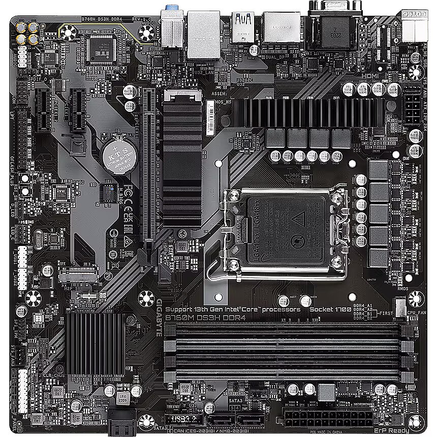 ShortSummaryDescription - GIGABYTE B760M DS3H DDR4 Motherboard - Supports Intel Core 14th Gen CPUs, 6+2+1 Phases Digital VRM, up to 5333MHz DDR4 (OC), 2xPCIe 4.0 M.2, 2.5GbE LAN, USB 3.2 Gen2, Intel, LGA 1700, Intel® Celeron®, Intel® Core™ i3, Intel® Core™ i5, Intel® Core™ i7, Intel® Core™ i9,..., LGA 1700, 128 GB, DDR4-SDRAM