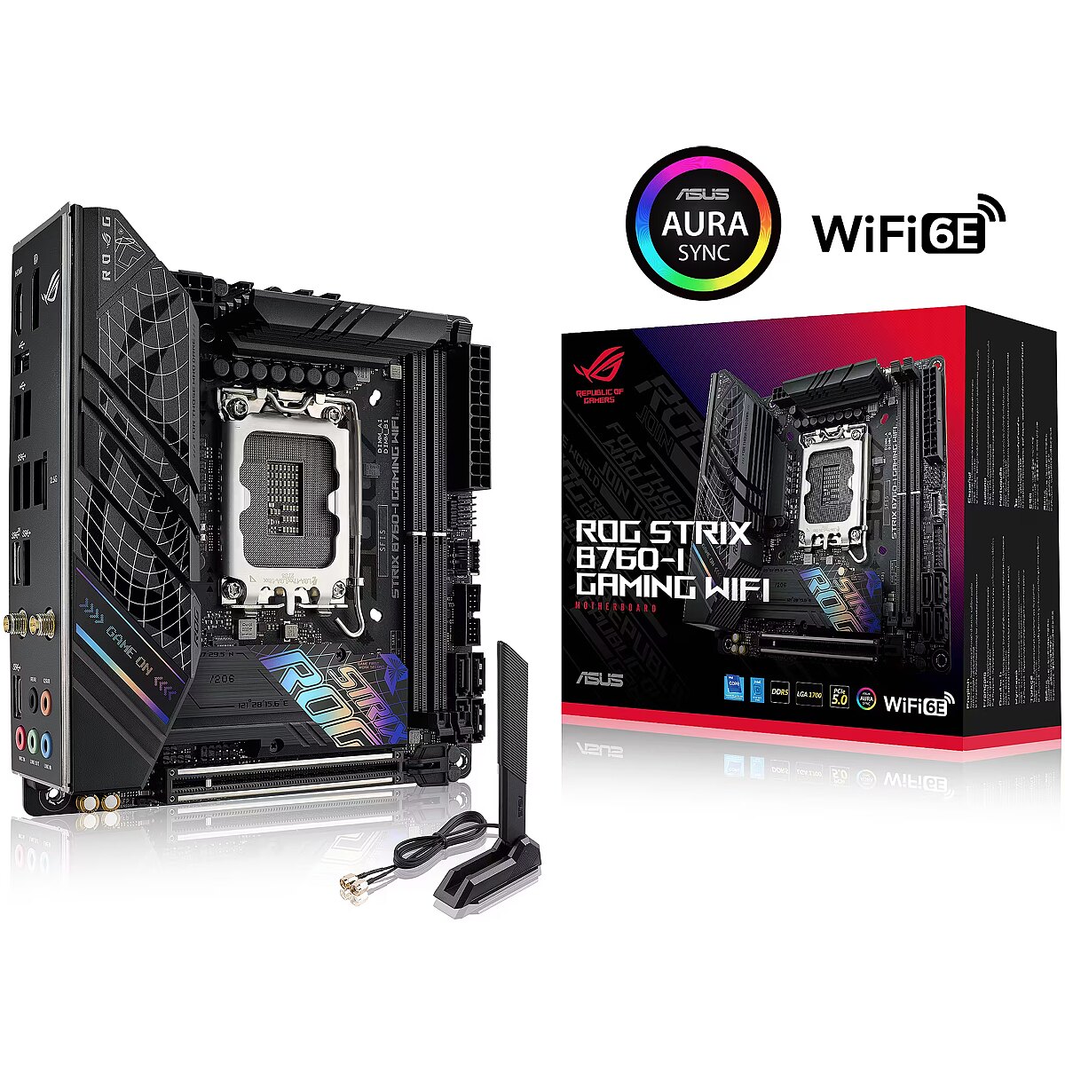 Summary - ASUS ROG STRIX B760-I GAMING WIFI. Processor manufacturer: Intel, Processor socket: LGA 1700, Compatible processor series: Intel® Celeron®, Intel® Core™ i3, Intel® Core™ i5, Intel® Core™ i7, Intel® Core™ i9,.... Supported memory types: DDR5-SDRAM, Maximum internal memory: 64 GB, Memory slots type: DIMM. Supported storage drive interfaces: M.2, SATA III, Supported storage drive types: HDD & SSD, RAID levels: 0, 1, 5, 10. Ethernet interface type: 2.5 Gigabit Ethernet, Top Wi-Fi standard: Wi-Fi 6E (802.11ax), Wi-Fi standards: 802.11a, 802.11b, 802.11g, Wi-Fi 4 (802.11n), Wi-Fi 5 (802.11ac), Wi-Fi 6 (802.11ax), Wi-Fi 6E.... Component for: PC, Motherboard form factor: mini ITX, Motherboard chipset family: Intel