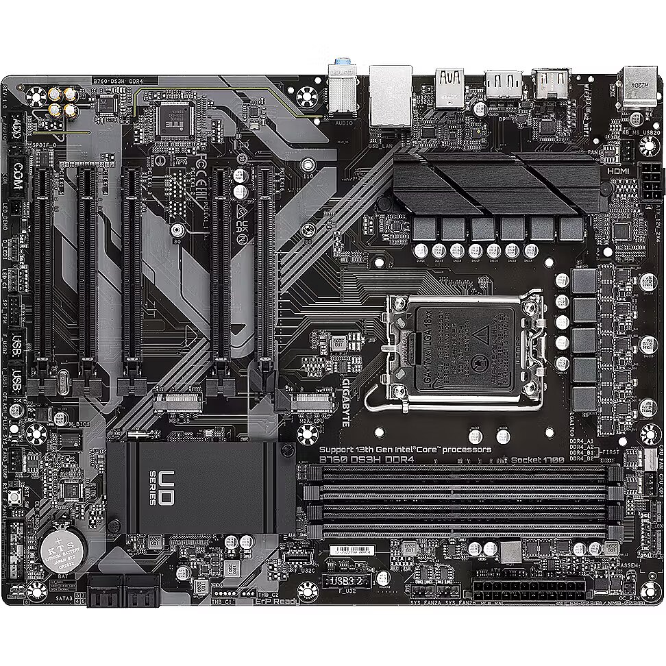 ShortSummaryDescription - GIGABYTE B760 DS3H DDR4 Motherboard - Supports Intel Core 14th CPUs, 18+2+1 Phases Digital VRM, up to 5333MHz DDR4 (OC), 2xPCIe 4.0 M.2, GbE LAN, USB 3.2 Gen 2, Intel, LGA 1700, Intel® Celeron®, Intel® Core™ i3, Intel® Core™ i5, Intel® Core™ i7, Intel® Core™ i9,..., LGA 1700, 128 GB, DDR4-SDRAM