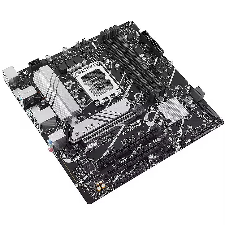 Specifications:Model: Prime B760M-A D4-CSMChipset: Intel B760Socket: LGA 1700Form factor: Micro-ATX (24.4 × 24.4 cm)CPU support: Intel Core 12th / 13th / 14th Gen, Pentium Gold, CeleronMemory: 4 × DDR4 DIMM slots, up to 128 GB, 5333 MHz (OC), Dual-channel, XMP supportExpansion slots: 1 × PCIe 5.0 x16, 1 × PCIe 3.0 x16 (x4), 1 × PCIe 3.0 x1Storage: 2 × M.2 (PCIe 4.0 x4), 4 × SATA 6 Gb/sGraphics outputs: HDMI 2.1, DisplayPort 1.4, D-Sub (VGA)Networking: Intel I219-V 1 Gb EthernetAudio: Realtek 7.1 Channel HD Audio (24-bit / 192 kHz)Rear USB ports: 1 × USB 3.2 Gen 2×2 (Type-C), 2 × USB 3.2 Gen 2, 2 × USB 3.2 Gen 1, 2 × USB 2.0Internal USB: 1 × USB 3.2 Gen 1 (header), 1 × USB 3.2 Gen 1 (Type-C), 2 × USB 2.0 headersCooling: VRM and M.2 heatsinks, hybrid fan headers, water cooling supportProtection: ASUS 5X Protection III, DIGI+ VRM, LANGuard, SafeSlot Core+, OptiMem IILighting: AURA Sync RGBBIOS: UEFI AMIOS support: Windows 11 / 10 (64-bit)Model year: 2024Package contents: Motherboard, SATA cables, screws, manual, software CD
