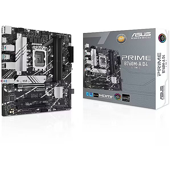 Summary - ASUS PRIME B760M-A D4-CSM. Processor manufacturer: Intel, Processor socket: LGA 1700, Compatible processor series: Intel® Celeron®, Intel® Pentium® Gold, Intel® Core™ i3, Intel® Core™ i5, Intel® Core™.... Supported memory types: DDR4-SDRAM, Maximum internal memory: 128 GB, Memory slots type: DIMM. Supported storage drive interfaces: M.2, SATA III, Supported storage drive types: HDD & SSD, RAID levels: 0, 1, 5, 10. Ethernet interface type: 2.5 Gigabit Ethernet. Component for: PC, Motherboard form factor: micro ATX, Motherboard chipset family: Intel