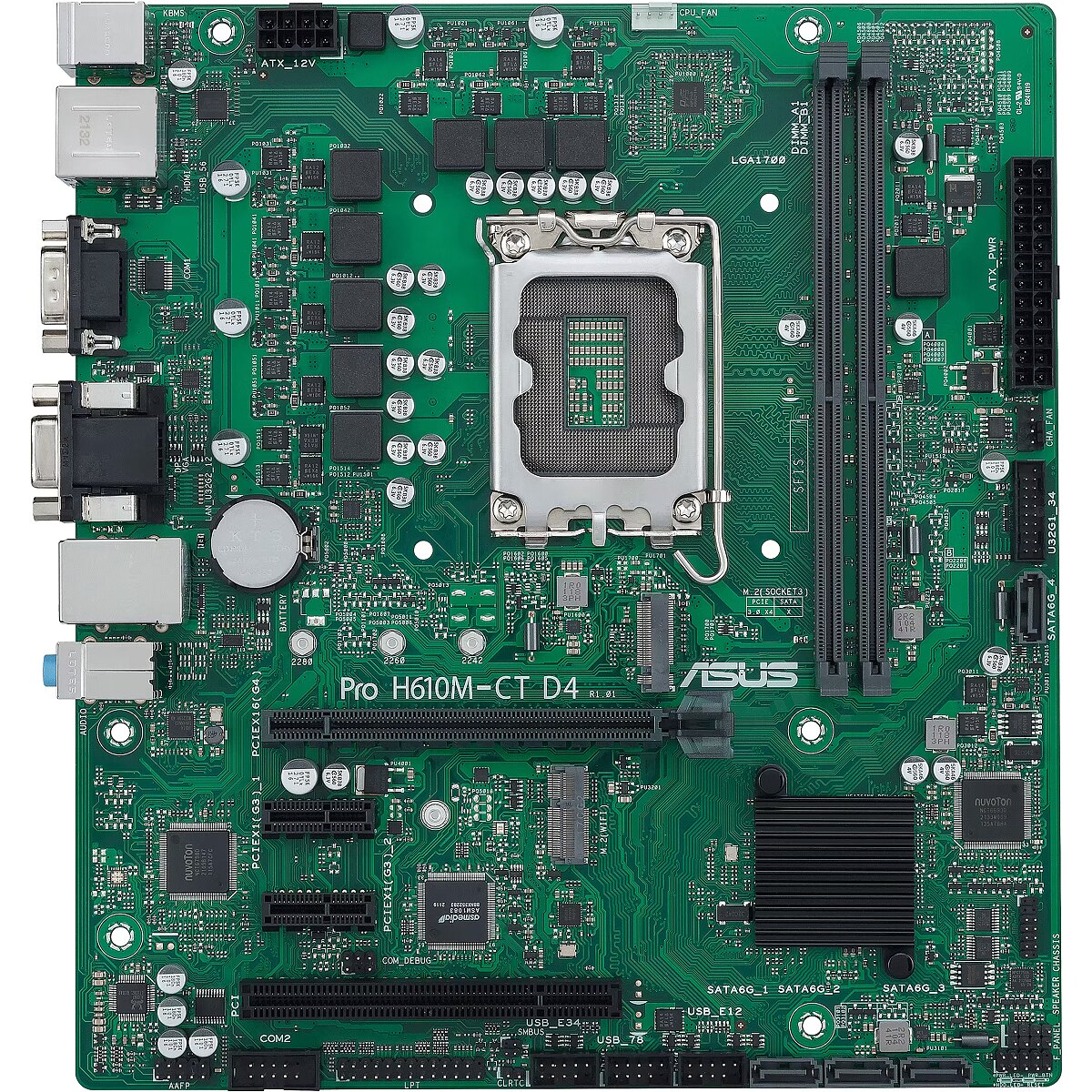 LongSummaryDescription - ASUS PRO H610M-C D4-CSM. Processor manufacturer: Intel, Processor socket: LGA 1700, Compatible processor series: Intel® Celeron®, Intel® Core™ i3, Intel® Core™ i5, Intel® Core™ i7, Intel® Core™ i9, Intel® Pentium®. Supported memory types: DDR4-SDRAM, Maximum internal memory: 64 GB, Memory slots type: DIMM. Supported storage drive interfaces: M.2, SATA III, Supported storage drive types: HDD & SSD. Ethernet interface type: Gigabit Ethernet. Component for: PC, Motherboard form factor: micro ATX, Motherboard chipset family: Intel
