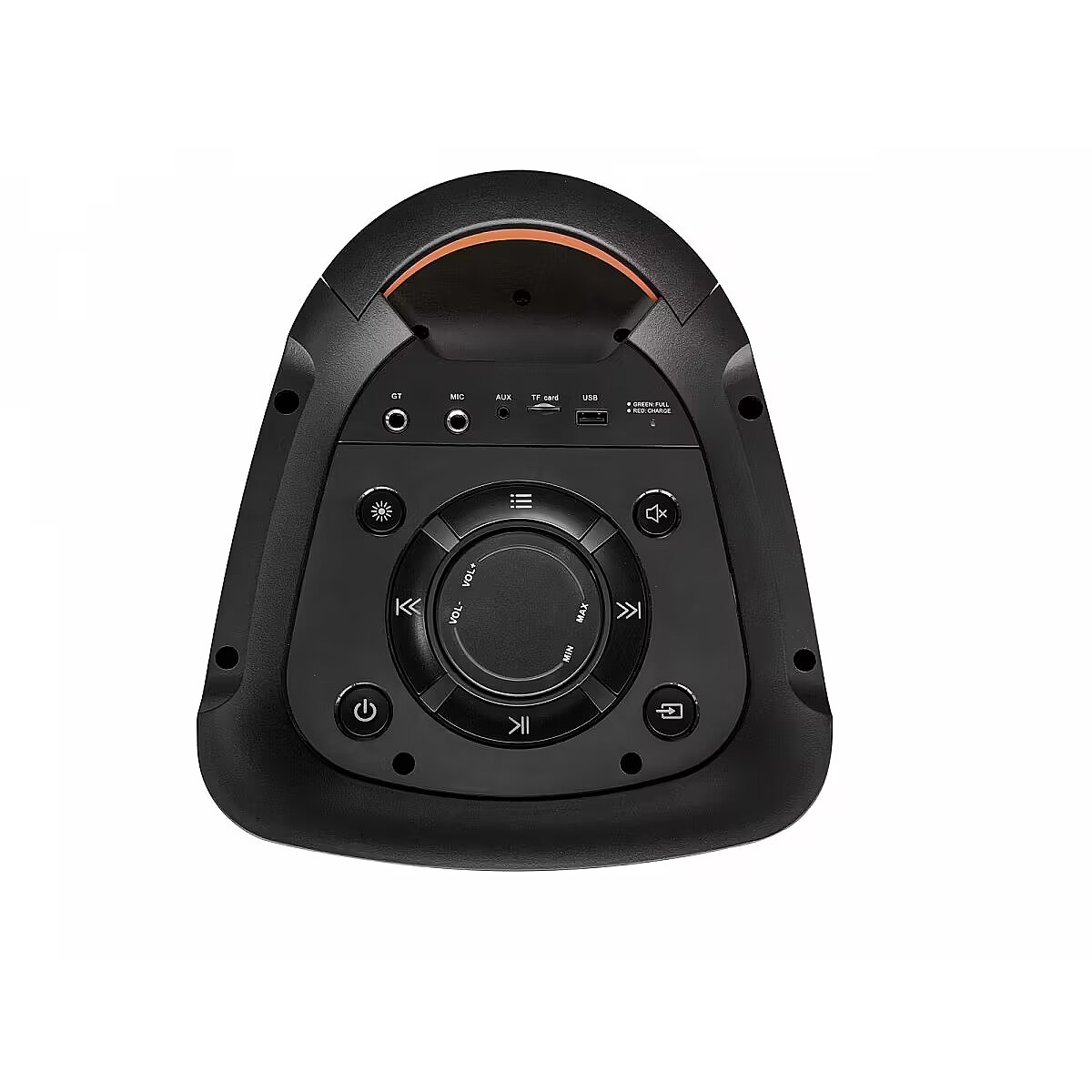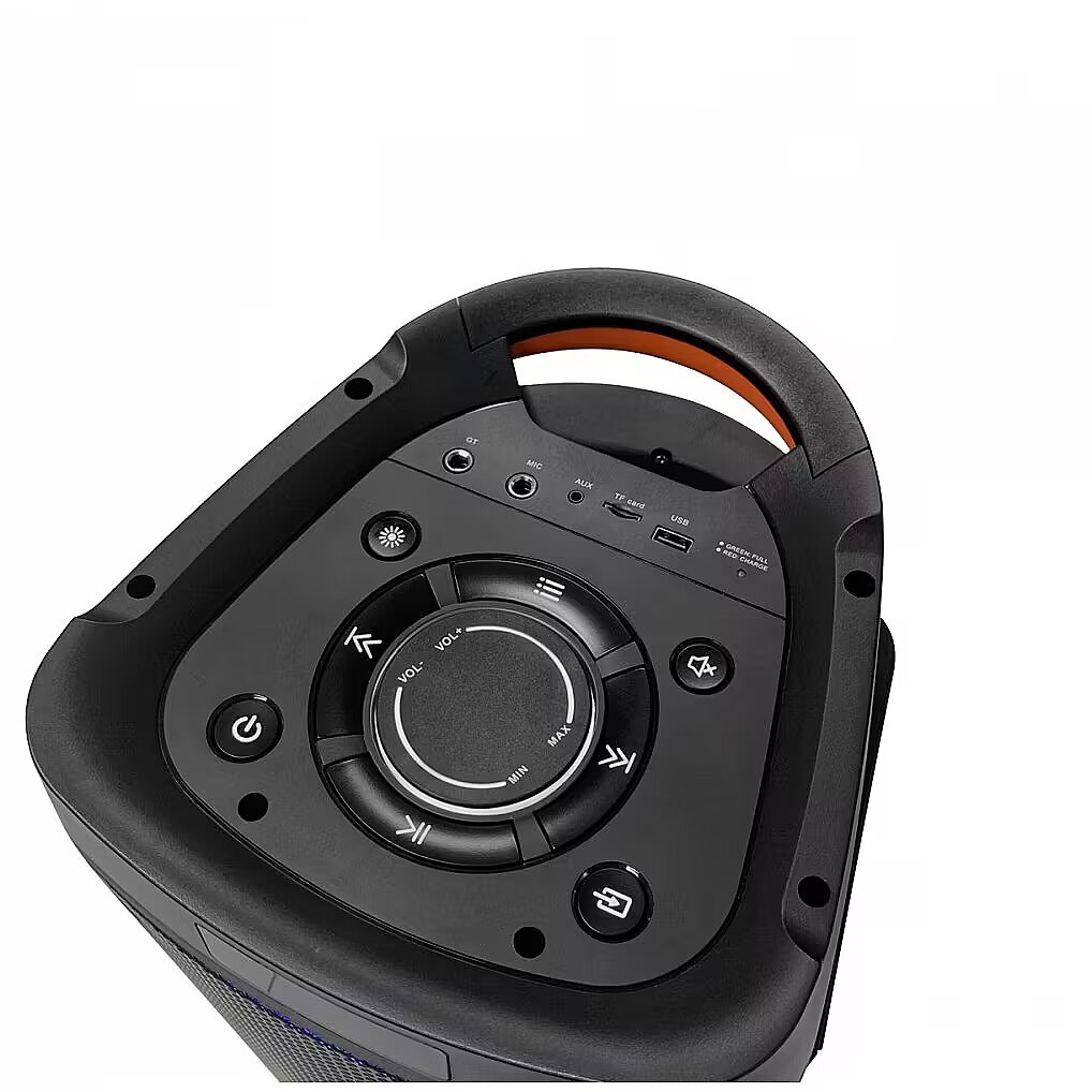 Other features - Bluetooth do odtwarzania muzyki poprzez profil audio streaming (A2DP) Funkcja bezprzewodowego stereo (TWS) Odtwarzacz USB/microSD Odtwarzanie plików MP3 Radio FM z pamięcią 40 stacji Regulacja basów i sopranów Funkcja karaoke z dwoma mikrofonami bezprzewodowymi w zestawie Pilot zdalnego sterowania Wejście AUX, Gitara, 1 x mikrofon przewodowy Wyświetlacz LED Kolorowe oświetlenie Disco LED Moc maksymalna: 500 Watt Zasilanie sieciowe: AC 110-240 V~50/60 Hz Zasilanie bateryjne: wbudowany akumulator 7,4 V/ 5 Ah