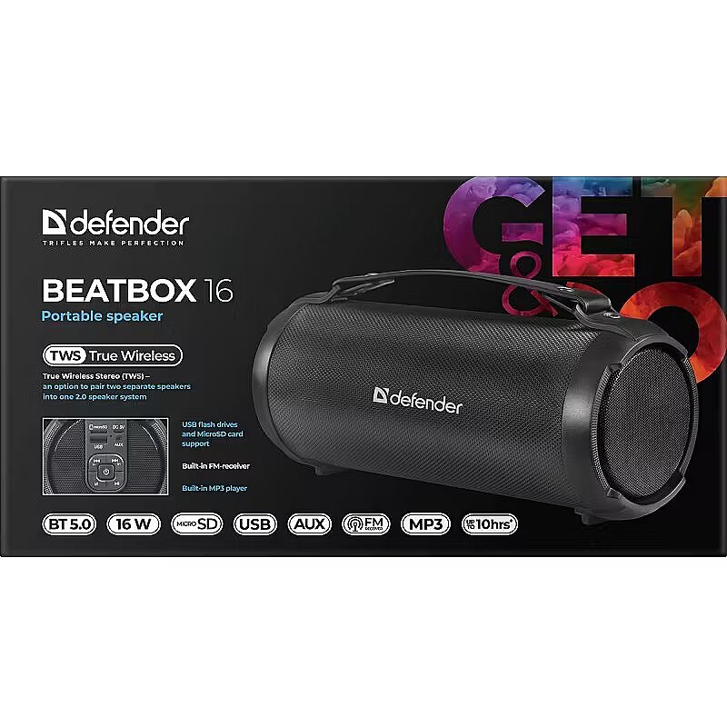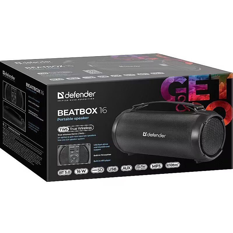 Description - Defender Beatbox 16 Bluetooth 16W Speaker. Portable Bluetooth speaker with built-in MP3 player and FM tuner. Supports USB flash drives and microSD memory cards