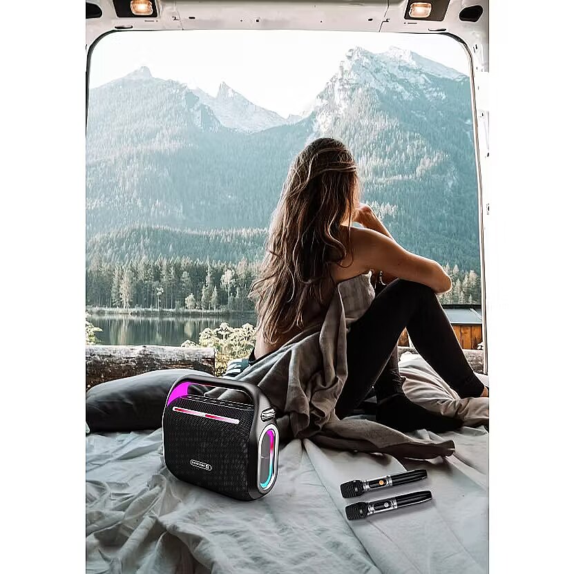 Komplektā ietilpst arī mikrofons, kas piedāvā izklaidi jebkurā ballītē vai svinībās. Tas vienkārši tiek savienots pārī ar skaļruni, un tad var sākties karaoke vai hostings.