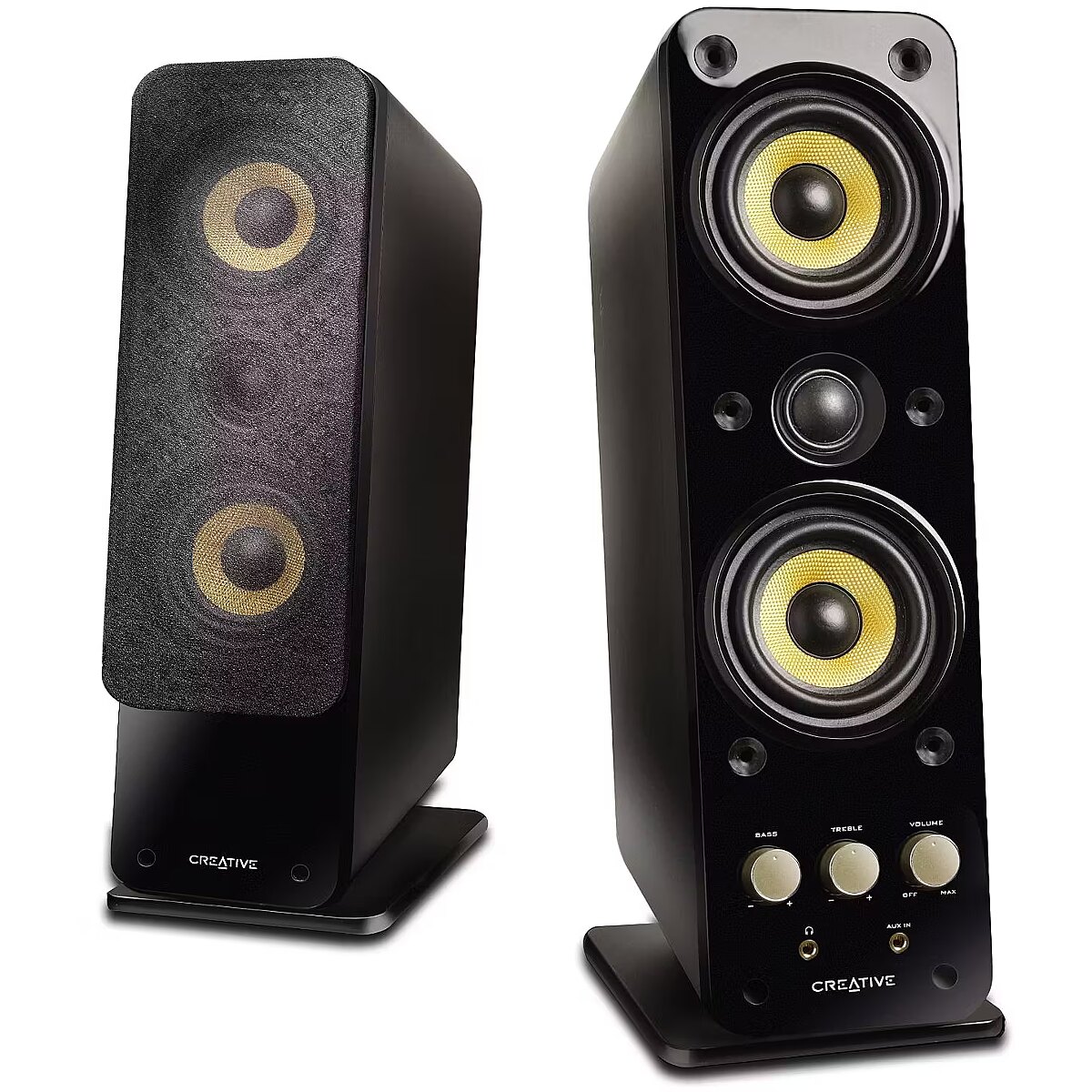 Speaker System GigaWorks T40 Series II is designed to ensure sound quality and design at the highest level. New advanced 2.0 Speakers in black combine the best components and real power typical of products GigaWorks series and deliver pure music. Each speaker features two woofer drivers with woven fiberglass cones for warmth, and an advanced treble pickup with cloth dome for clarity. Drivers are arranged in MTM (midrange-tweeter-midrange), which provides excellent sound reproduction and further reinforced by the technology Creative BasXPort ™ bass, guaranteeing suggestive bass. GigaWorks T40 Series II are characterized by high power, front-panel controls and two inputs for simultaneous connection to different sources. It is a system for users with the highest demands.3-Driver audiophile configuration- Improve overall sonic spectral balance for music that sounds fuller, warmer and more faithful to the original source.Woven glass fiber cone driver- Experience rich, clear midrange audio and a broader sound stage.Cloth dome tweeter- Hear crisp, detailed highs with a dedicated tweeter.BasXPort™ technology for enhanced bass- Enhance the low frequency response without the bulkiness of a subwoofer.Convenient access- Get the bass, treble and volume you want with the easily maneuvered controls.