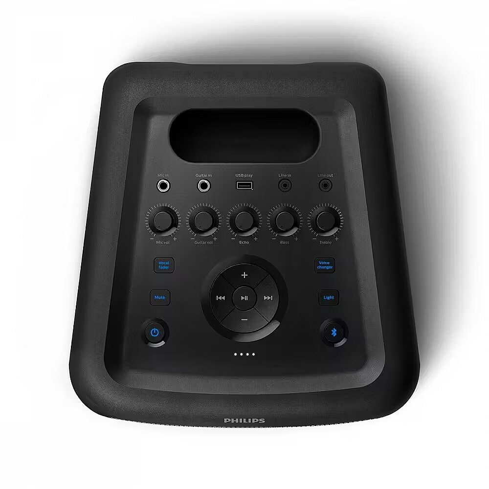 Wejście mikrofonu (6,3 mm) pomagają rozkręcić imprezę. Dostępne jest także wejście gitary, dzięki czemu możesz śpiewać, grając solówkę. Zarówno gitara, jak i mikrofon mają własne regulatory głośności na głośniku. Możesz także zmienić głos, stopniowo wyciszać wokale i dodać efekt echa.