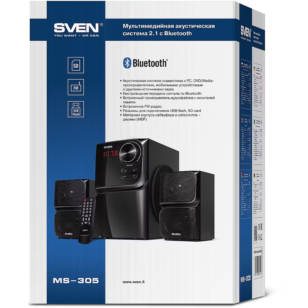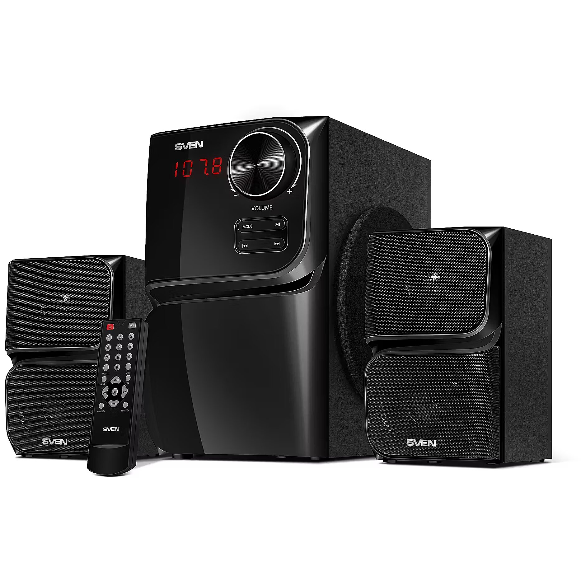 LargeDescHTML - Speaker system is compatible with PCs, DVD/Media-players, mobile devices and other sound sourcesWireless signal transmission via Bluetooth moduleBuilt-in audio les player from external storage devicesBuilt-in FM radioAlphanumeric LED displayUSB ash port and SD card slotRemote controlMUTE and ST-BY modesWooden (MDF) cabinets of the subwoofer and satellites