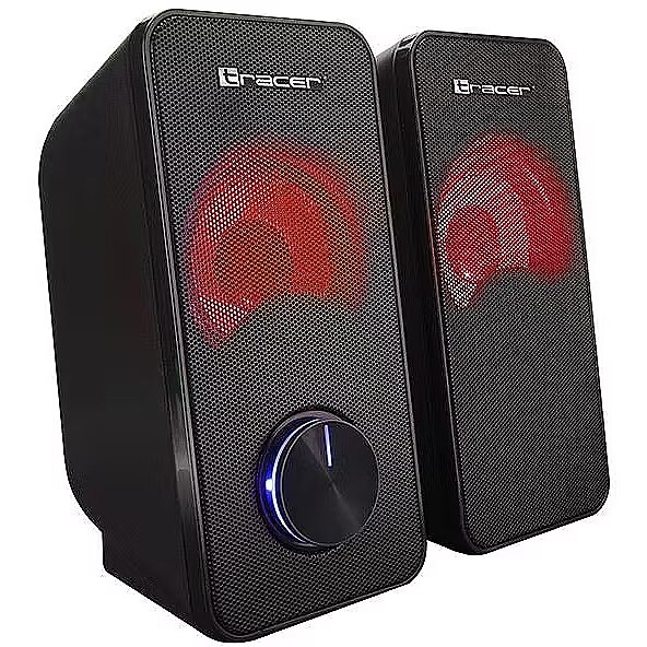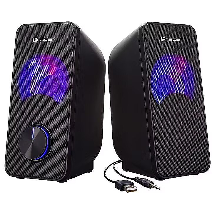 Description - Głośniki 2.0 TRACER Loop wyróżniają się przede wszystkim nowoczesnym designem. Dzięki zastosowaniu tęczowego podświetlenia RGB nie można przejść obok nich obojętnie. Odtwarzaj ulubioną muzykę, graj w gry, oglądaj filmy. Korzystaj z wyjątkowego podświetlenia LED. Tęczowe podświetlenie Działa z każdym urządzeniem wyposażonym w wejście 3,5 mm Duży, wygodny podświetlony potencjometr głośności umieszczony z przodu, zintegrowany włącznik Solidna metalowa siatka dla dodatkowej ochrony na frontowej części satelit Zasilanie USB