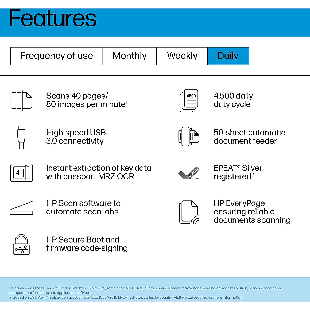 LongSummaryDescription - HP ScanJet Pro 4200 s1. Maximum scan size: 1200 x 1200 mm, Optical scanning resolution: 600 x 600 DPI, Input colour depth: 48 bit. Scanner type: ADF scanner, Product colour: Blue, White. Sensor type: CIS, Daily duty cycle (max): 4500 pages, Scan file formats: BMP, CSV, DOC, DOCX, JPEG, PDF, RTF, TXT, XLSX. Auto document feeder (ADF) input capacity: 50 sheets. Maximum ISO A-series paper size: A4, ISO A-series sizes (A0...A9): A4, A5, A6, A7, A8