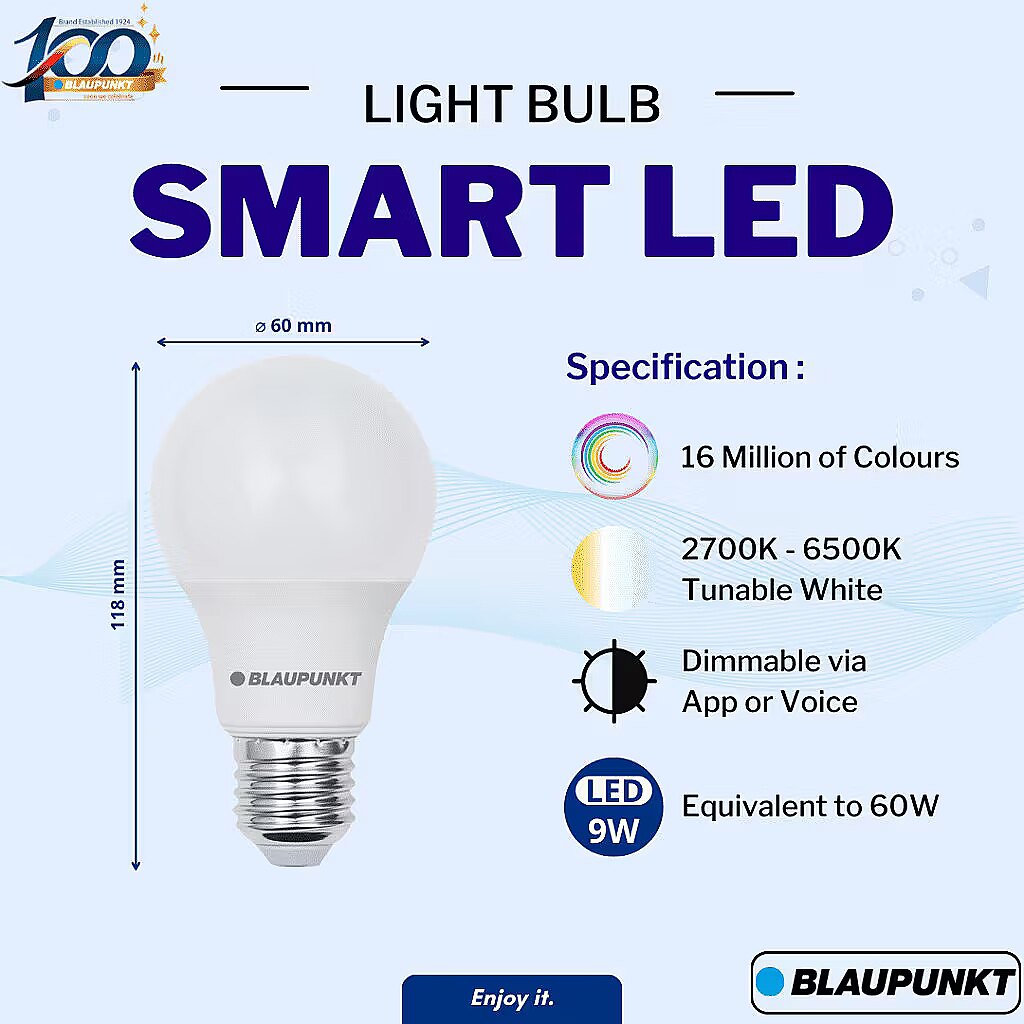 description_en - Smart bulb with E27 socket 9 W power consumption, equivalent to a 60 W incandescent lamp 900 lm luminous flux RGB + White (2700–6500 K) light 220° beam, CRI > 80 Dimmable via app or voice Tuya or Smart Life app Bring Blaupunkt LED Smart WIFI Light Bulb into your everyday life and create the perfect atmosphere in your home and workplace. Learn how colours add mood and enhance your interior design while saving energy and reducing your bills. Now all this is possible with Blaupunkt LED lighting. White Mode for regular use
