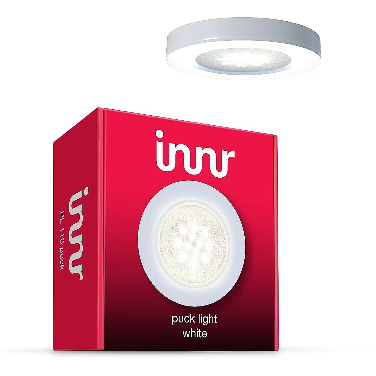 Technical_details - Energy efficiency class: G Weighted energy consumption: 3 kWh / 1000 hours Lamp luminous flux: 165 lumens Power consumption: 3 watts Average rated lamp life: 25000 hours Design: spotlight Type: LED Light EAN: 8718781552466 Manufacturer No.: PL 110 puck Smart home: Alexa, Philips Hue, Samsung SmartThings, Zigbee Use: recessed light Dimmable: yes Details: 15 LEDs Color temperature: 2700 Kelvin (warm white) Light color: white Beam angle: 120 degrees Power supply: power cord Additional information: dimmable from 100 to 1% | Protocol: Zigbee Lightlink Note: This set can only be used as an extension to an existing set of 3 INNR Puck Lights (sold separately). Does not work with Apple HomeKit and Hue Entertainment features (sync). A bridge, which is not included in the scope of delivery, is required to control INNR products within a Zigbee network. Dimension: Width: 70mm x Height: 15mm x Depth/Length: 70mm Weight: 97 grams
