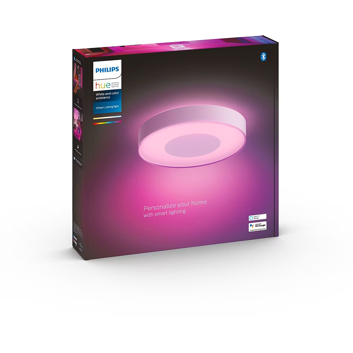 LongSummaryDescription - Philips Hue White and colour ambience Infuse large ceiling lamp. Type: Smart ceiling light, Interface: Bluetooth/Zigbee, Product colour: White. Mobile operating systems supported: Android, iOS. Energy efficiency class: G, Energy consumption per 1000 hours: 54 kWh, Input voltage: 50–60 Hz. Width: 425 mm, Depth: 425 mm, Height: 86 mm. Package type: Box, Package width: 476 mm, Package depth: 502 mm