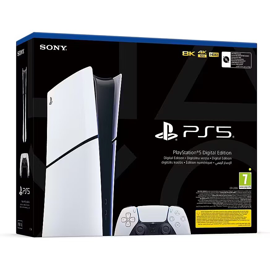 LongSummaryDescription - Sony PlayStation 5 Digital E Chassis (Slim). Platform: PlayStation 5, Product colour: Black, White, Internal memory: 16384 MB. Storage media: SSD, Internal storage capacity: 825 GB, Read speed: 5500 MB/s. Ethernet LAN data rates: 10,1000,100 Mbit/s, Ethernet interface type: Gigabit Ethernet, Wi-Fi standards: 802.11a, Wi-Fi 5 (802.11ac), 802.11b, Wi-Fi 6 (802.11ax), 802.11g, Wi-Fi 4 (802.11n). HD type: 8K Ultra HD, Supported video modes: 2160p, 4320p, Audio decoders: Dolby Digital Plus, DTS-HD Master Audio 5.1, DTS, DTS 2.0, DTS 5.1, Dolby Digital 5.1, DTS-HD,.... Game controllers included: Gamepad, Cables included: AC, HDMI, USB, Packaging content: PlayStation®5 console DualSense® Wireless Controller 2 plastic stand feet to place the console...