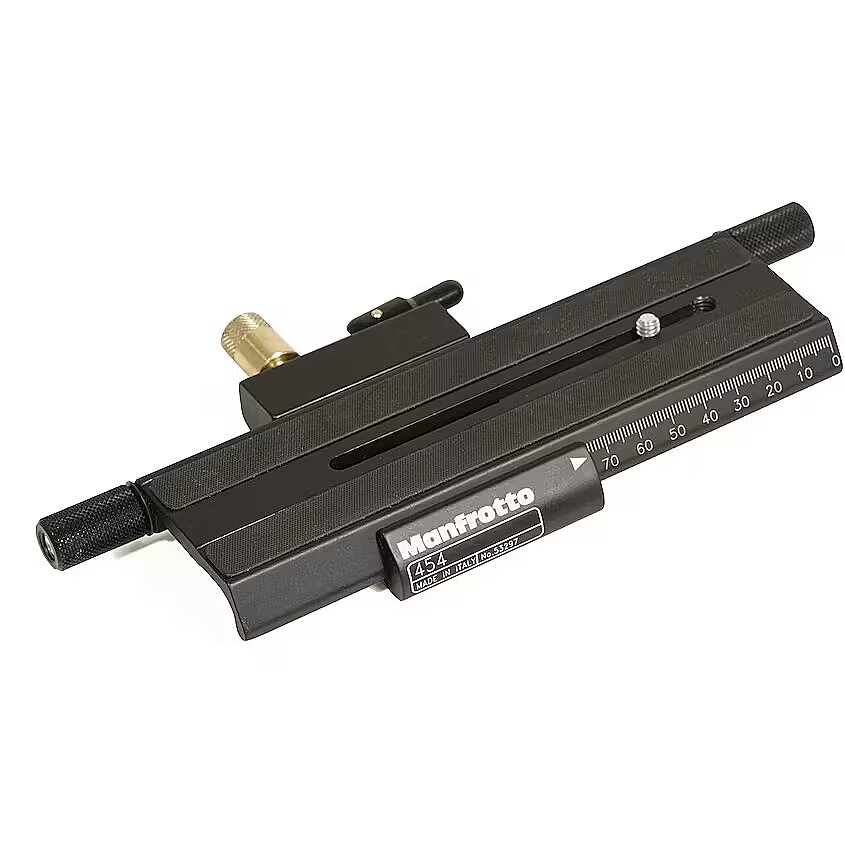 description_en - A sliding plate is ideal for macro photography to make precise positioning movements to achieve the perfect framed shot, for QTVR and other precise copy/repro worksliding plate. The Manfrotto 454 has fingertip control for hairsbreadth positioning but with a simple lock-release lever for fast set-up. Two plates can be interlocked at 90° for full lateral/forward/back movement (over 120 mm). In extruded aluminium, the plate has 1/4" and 3/8" holes and screws for tripod and camera mounting.