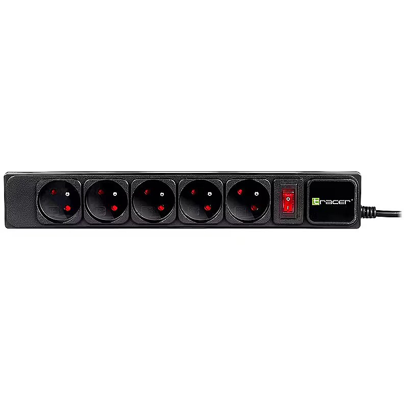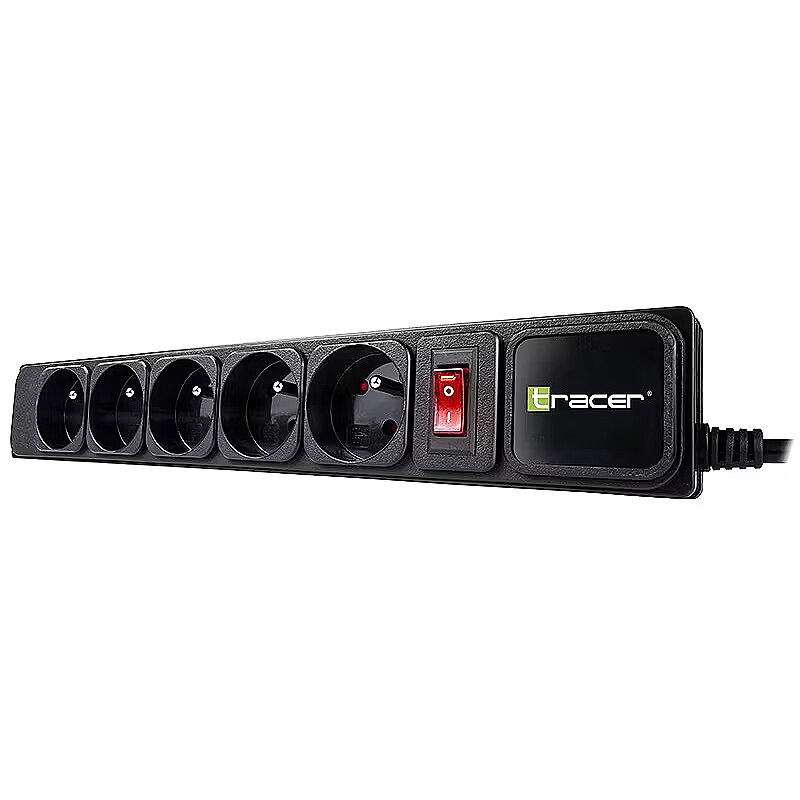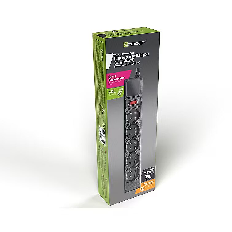 Description - TRACER PowerGear power strip A power strip is a convenient and economical device designed for use at home and in the office. Tracer PowerGear is equipped with a special mechanical lock system that protects children against the possibility of electric shock when trying to contact a phase wire. The Tracer PowerGear power strip can be used as a regular extension cord, as well as protection against environmental factors (e.g. lightning) and voltage fluctuations in power sockets. This type of protection will work both at home and in the office. The high-quality power cable complies with the VDE standard. VDE standard The power cord of the Tracer PowerGear strip complies with the VDE standard, which means that it meets the quality and safety requirements for electrical equipment and products. When purchasing a device compliant with the VDE standard, we can be sure that it has been tested in electrical, mechanical, toxic, thermal and radiological terms, and the device's resistance to factors that directly affect the user's safety when working with it has been checked. Specification 5 sockets. Mechanical lock system. Automatic switch off. Surge protection. Illuminated switch. Maximum power 2300 W. Housing made of non-flammable material. Mains cable compliant with VDE standard. 5 m long power cable. Surge protection system The surge protection system provides protection against damage due to overvoltages (temporary voltage increases) occurring in the electrical network, e.g. caused by lightning.