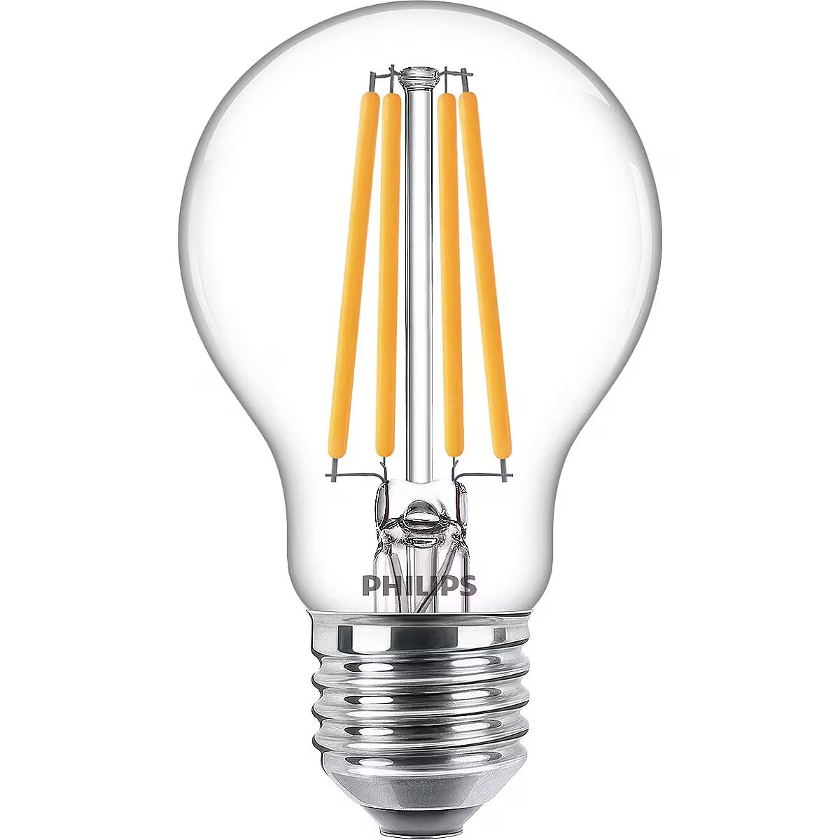 LongSummaryDescription - Philips Filament Bulb Clear 100W A60 E27. Bulb power: 10.5 W, Equivalent bulb power: 100 W, Fitting/cap type: E27, Luminous flux: 1521 lm, Bulb lifetime: 15000 h, Light colour: Warm white, Colour temperature: 2700 K, Color Rendering Index (CRI): 80, Power factor: 0.52