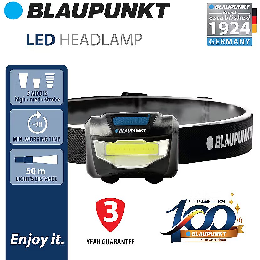 description_en - Blaupunkt BT-HL9023C is a practical and durable LED headlamp with a luminous flux of 200 lm. The lamp has three operating modes: high, medium, strobe. The flashlight uses 3 × AAA batteries (not included) to operate. IPX4 weather resistance and a 50-meter operating distance allow the flashlight to be used outdoors. Practical LED headlamp Battery type: 3 × AAA (not included) Three operating modes Color temperature: cool white Luminous flux: 200 lm Working distance: 50 m IPX4 weather resistance